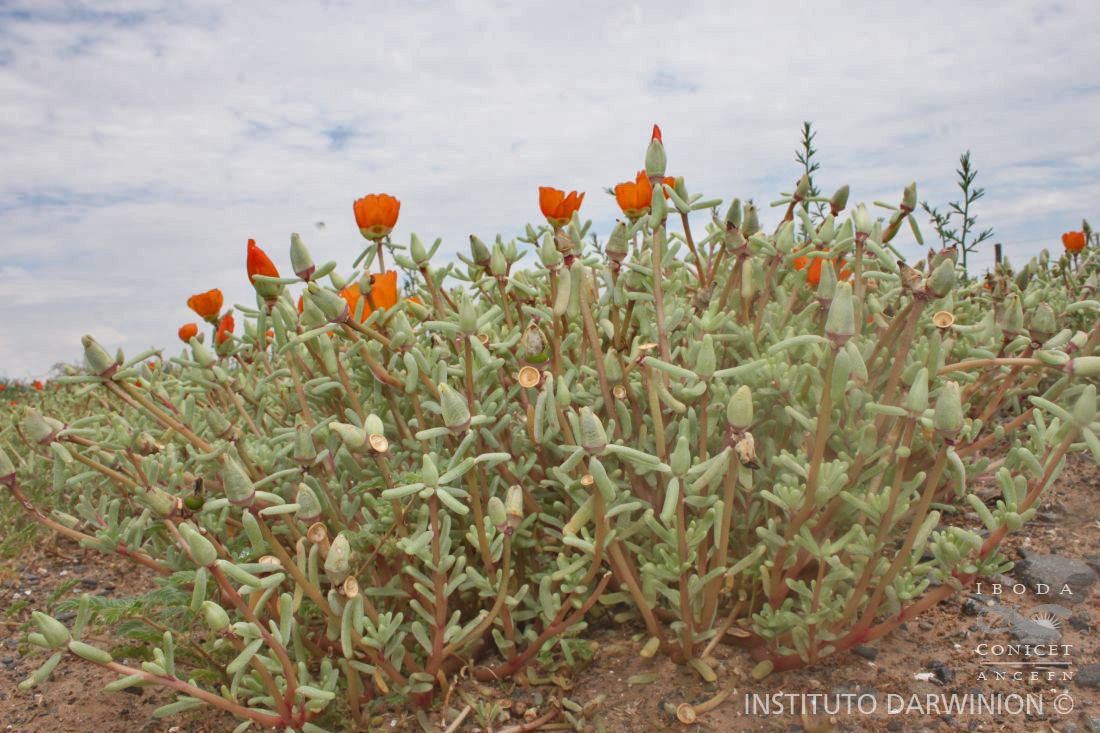 Panta anual, glabras, con los tallos algo carnosos, rojizos. Hojas linear-lanceolada a espatulada, de 1,5-3,5 x 0,2-0,5 cm, obtusas, de ápice truncado. Flores solitarias, de ca. 4 cm de diámetro, con los sépalos ovados, de 8-12 x 8-9 mm; pétalos obcordados, de 20-30 mm de largo, purpúreos con una mácula basal negra; flores rodeadas por 2-5 hojas apicales y bracteolas lineares, de 8-10 mm de largo; estambres 8-10 o mas; estilo de ca. 10 mm de largo, con 5 ramas estigmáticas de 2 mm de largo. Fruto una cápsula, de 7-10 mm de largo, ocupada en su mayor parte por el opérculo acampanado hasta cónico, de ca. 6 mm de largo. Semillas de 1,7-2 mm de diámetro, achatadas, con 4 hilares dorsales de grandes espinas anseriformes, de 0,3-0,4 mm de largo, pardo-rojizas.