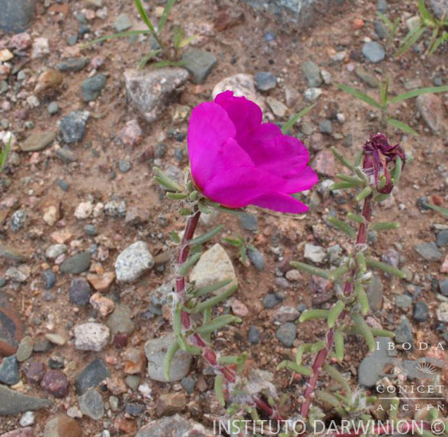 Observaciones: Observación I: Esta especie se reconoce fácilmente por sus flores, en general grandes, las cuales "in sicco" aparecen rodeadas por un verticilo de 8-12 hojas más largas que las demás. Los pelos axilares, por lo observado, parecen ser caducos. La ornamentación de la semilla es, muchas veces, variable. Observación II: El grano de polen es pantocolpado y el de mayor tamaño dentro de las Portulacáceas; su diámetro es de 70 – 75 µ. Observación III: En la descripción original se acota: "Fue descubierta por Gillies creciendo en suelo arenoso, entre el Río del Saladillo o límite Oeste de las Pampas y el pie de las montañas, cerca de Mendoza". Se supone que la planta ornamental muy cultivada, conocida como "flor de seda" es una forma de esta especie, originada en semillas provenientes de plantas recogidas por Gillies hacia el año 1827 en la Provincia de Mendoza y enviadas a Europa. La "flor de seda" llamada así por la consistencia y brillo de sus pétalos, se propaga fácilmente por gajos, no requiere suelos ricos y crece muy bien en lugares secos, entre las piedras, etc. aunque necesita sol ya que, solo en su presencia abren las flores. Es bastante común verlas en jardines, formando borduras o en planteras, adornando balcones y terrazas, habiendo formas de flores simples, blancas, amarillas y anaranjadas, en diversos tonos y dobles, rojas hasta violadas.