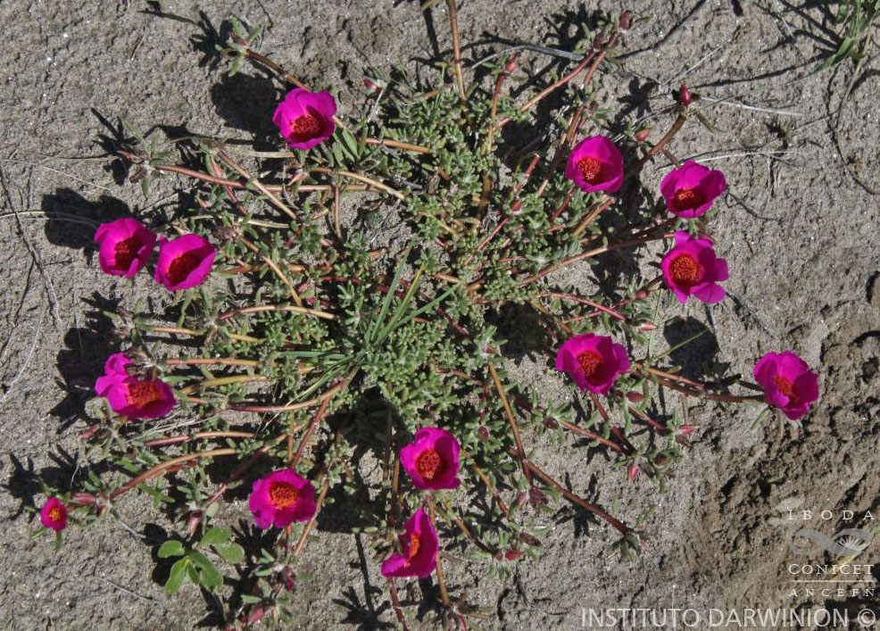 Observaciones: Observación I: Esta especie se reconoce fácilmente por sus flores, en general grandes, las cuales "in sicco" aparecen rodeadas por un verticilo de 8-12 hojas más largas que las demás. Los pelos axilares, por lo observado, parecen ser caducos. La ornamentación de la semilla es, muchas veces, variable. Observación II: El grano de polen es pantocolpado y el de mayor tamaño dentro de las Portulacáceas; su diámetro es de 70 – 75 µ. Observación III: En la descripción original se acota: "Fue descubierta por Gillies creciendo en suelo arenoso, entre el Río del Saladillo o límite Oeste de las Pampas y el pie de las montañas, cerca de Mendoza". Se supone que la planta ornamental muy cultivada, conocida como "flor de seda" es una forma de esta especie, originada en semillas provenientes de plantas recogidas por Gillies hacia el año 1827 en la Provincia de Mendoza y enviadas a Europa. La "flor de seda" llamada así por la consistencia y brillo de sus pétalos, se propaga fácilmente por gajos, no requiere suelos ricos y crece muy bien en lugares secos, entre las piedras, etc. aunque necesita sol ya que, solo en su presencia abren las flores. Es bastante común verlas en jardines, formando borduras o en planteras, adornando balcones y terrazas, habiendo formas de flores simples, blancas, amarillas y anaranjadas, en diversos tonos y dobles, rojas hasta violadas.