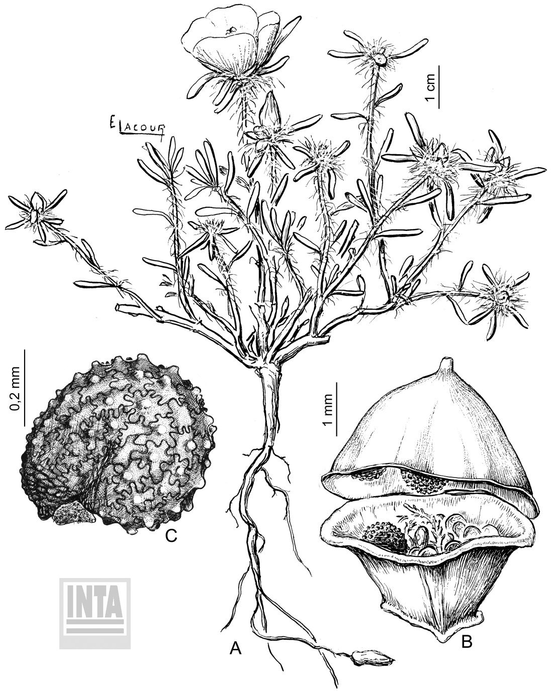Hierba anual con las raíces frecuentemente tuberosas, tallos de 10-13 cm, erectos y decumbentes, rojizos. Hojas lanceoladas a levemente espatuladas, de 8-25 x 2-3,5 mm, de áppice agudo o subagudo, alternas, carnosas, sésiles o subsésiles, de sección subcircular, talón basal redondeado, corto y libre, laxamente dispuestas; pelos estipulares en general de mayor longitud que las hojas o ausentes, abundantes, lanosos, blanquecinos. Flores hasta de 40 mm diámetro, rodeados por verticilos de 5-14 hojas apicales; sépalos obovados, de 6-25 mm de largo, uno deltoideo, el otro ovado con márgenes hialinos y el ápice emarginado, ambos apiculados-cuculiformes; pétalos obovados, de 7-20 mm de largo, anaranjados, rojo-punzó, solferinos o violado-morados; estambres alrededor de 50.; estilo de ca. 8 mm de largo: estigmas 5-12, lanceolados, presentando en los bordes cilias delgadas y muy juntas. Fruto una cápsula sésil, obovada, de 4-6 mm de largo, opérculo de 3 mm de largo, dehiscente poco más abajo de la línea media. Semillas globosas, de 0,7-1 mm de diámetro, rojizas a casi negras, acerado-irisadas, sublustrosas, tubérculos obtusos, negras, rojizas, verrucosas.