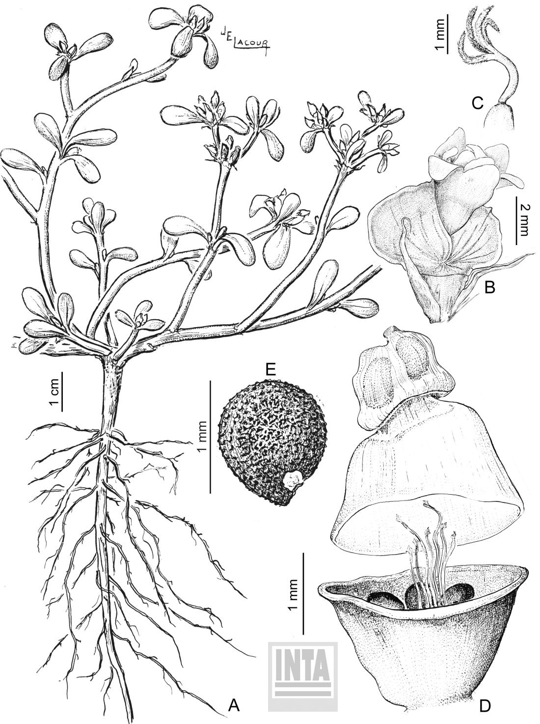 A. Planta en fruto. B. Flor con bractéolas. C. Detalle de estilo y ramas estigmáticas. D. Cápsula dehiscente. E. Semilla.