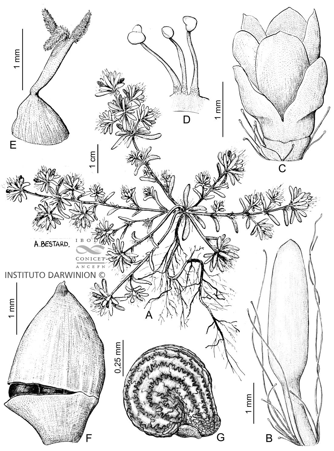 Hierba anual, postrada, de raíces delgadas y tallos muy ramificados, de 5-15(-20) cm de alto. Hojas lineales o subuladas, de 2-5(-10) mm de largo, de ápice obtuso o agudo, rollizas, con pilosidad lanosa; pelos estipulares, hasta 2-3 veces más largos que las hojas, abundantes. Flores muy pequeñas, amarillas, generalmente solitarias, rodeadas por un verticilo de 6 o más hojas; sépalos de dorso oscuramente carinado; pétalos elíptico-oblongos, de 2,5-4 mm de largo, libres entre sí, amarillos; estambres hasta 10; estilo con 3-4 ramas estigmáticas. Fruto una cápsula de 3-4 mm de largo, sésil, dehiscente por debajo de los 2/3 superiores, con opérculo subtubuloso hasta campanulado y de base subdiscoide. Semillas de 0,6-0,7 mm de aiámetro, negras, brillantes, de tegumento con células de la testa oblongas, ligeramente combadas, dispuestas en líneas longitudinales concéntricas.