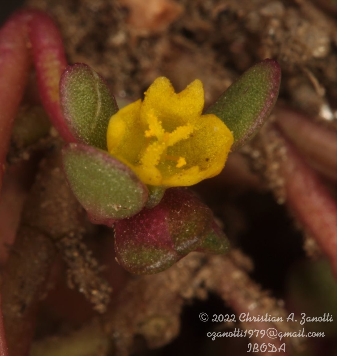 Plantas con raíces mas o menos engrosadas y suberosa con los tallos postrados, de 3-8 cm de largo, ramosas. Hojas alternas u opuestas, suborbiculares o cuneiformes, de 2-4 mm de largo, planas; pecíolos hasta de 2 mm de largo; pelos estipulares ausentes o inconspicuos; flores solitarias o agrupadas de a dos, o frecuentemente una de ellas abortadas, de 3-4 mm de diámetro, rodeadas por verticilos de 4 hojas, a veces se formas inflorescencias cimosas por ejes desarrollados a cada lado de las flores; sépalos ovados hasta subcuadrados, de 2,5 x 3 mm, subcarinados y de márgenes extendidos; estambres 6-10 sobre un anillo estaminal de 0,8 mm de ancho; estilo de 1,5-2 mm de largo, con 2(-3) ramas estigmáticas oblongo-lineales, de 0,8 mm de largo. Fruto una cápsula, dehiscentes debajo de la mitad, de 2,5-3,5 mm de largo; opérculo hemisférico. Semillas con tubérculos, negras.