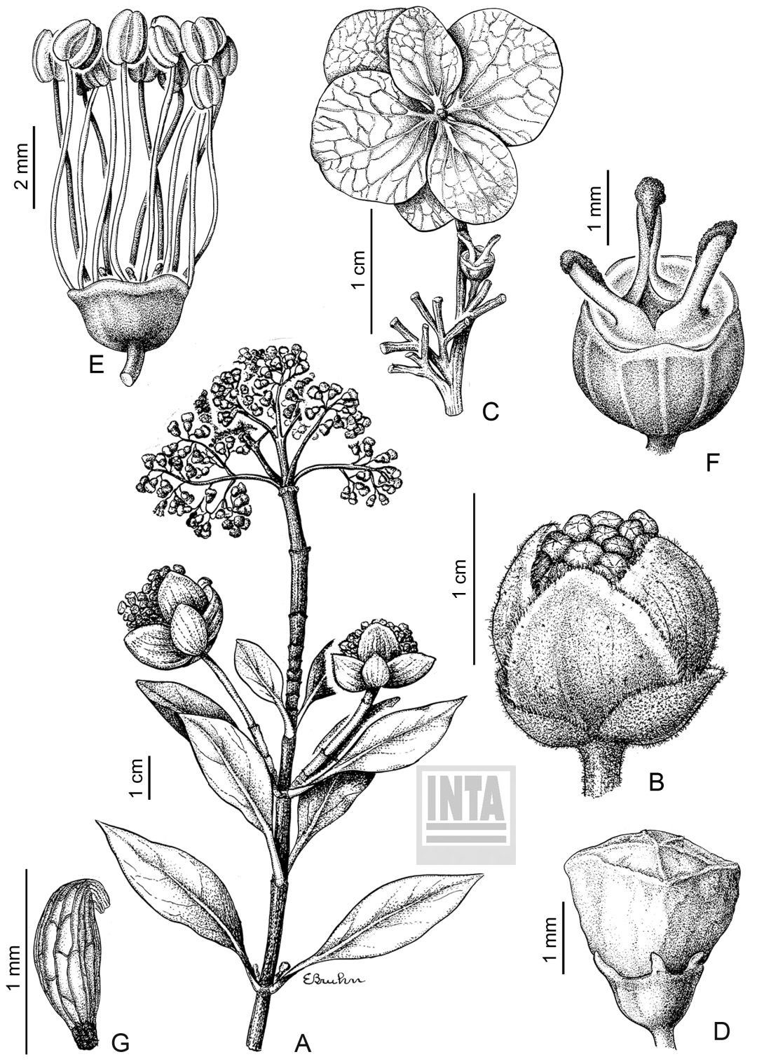 A. Porción de rama florífera. B. Inflorescencia. C. Flor estéril. D. Botón floral. E. Androceo y gineceo. F. Fruto. G. Semilla.