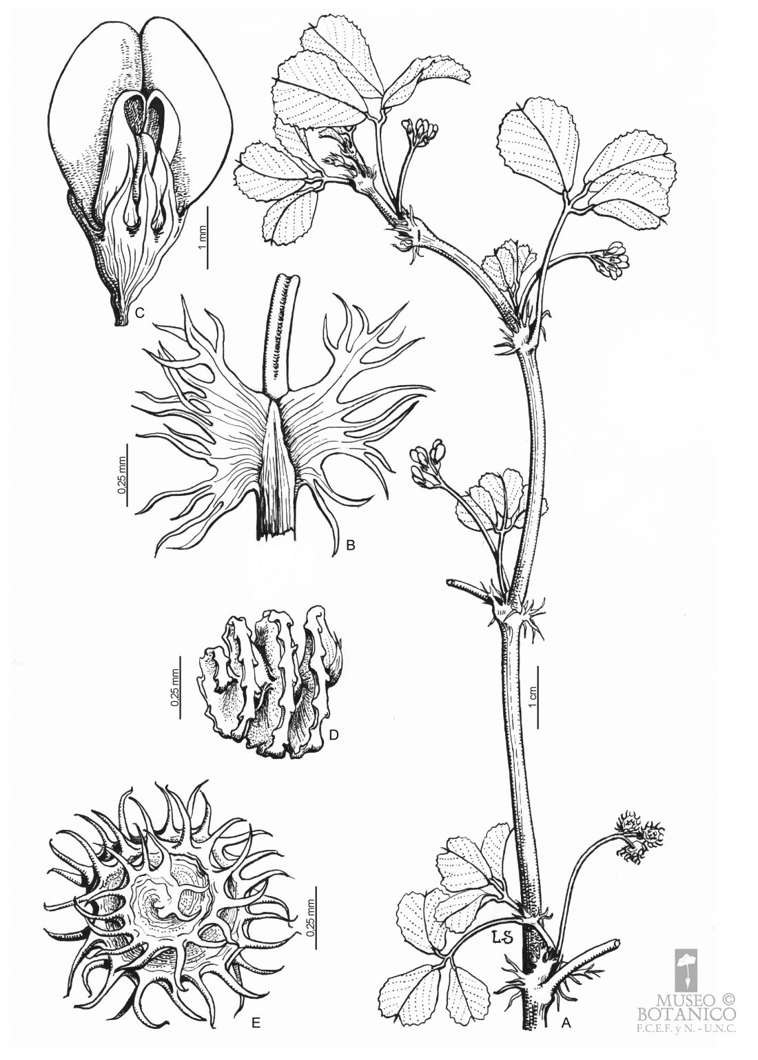 A. Rama. B. Estípulas. C. Flor vista desde la quilla. D-E. Frutos dimórficos sin espinas en las espiras y con ellas.