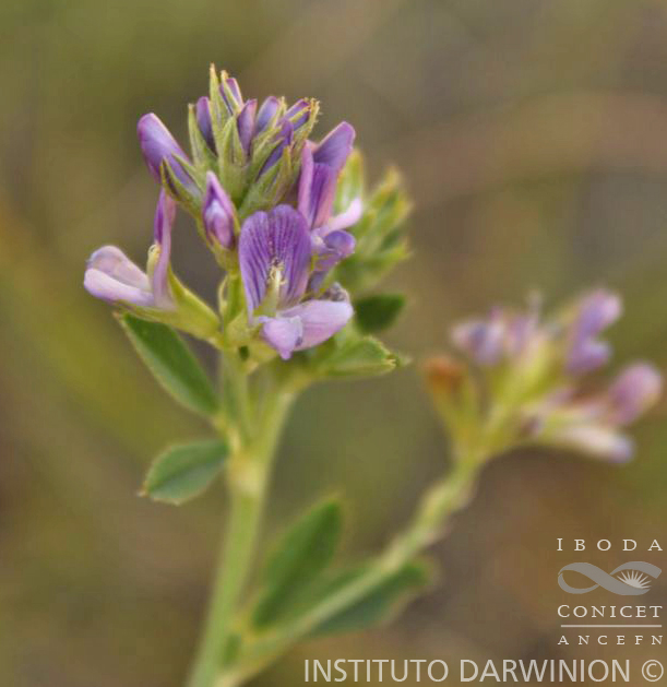 Planta herbácea, perenne, erecta o ascendente. Raíz gruesa, profunda. Rizomas bre¬ves, con o sin raíces adventicias. Yemas de renuevo formando una corona subleñosa, su¬perficialmente enterrada. Tallo de 25-130 cm alt. Folíolos de 2-4 x 0,5-2 cm, obovados, oblongos a lanceolados, los inferiores a veces orbiculares, truncados, emarginados, den¬tados en el tercio superior, ± pubescentes en la cara abaxial, rara vez en la adaxial. Estí¬pulas de 12-18 mm, lanceoladas a subuladas, subenteras o dentadas en la base, pilosas. Racimos 6-50-floros; cabezuela elipsoide. Flores de 10-12 mm, azules, violetas o blancas. Cáliz de 6-8 mm, pubescente; dientes triangulares, más largos que el tubo calicino. Vexi¬lo de 10-11 x 4-5,5 mm, oblongo a obovado, emarginado; alas de ± 9 mm carina de 7-8 mm. Ovario recto, piloso, 10-12-ovulado. Legumbre de 4-7 mm, inerme, discoide, forma¬da por 2-3 espiras, suavemente reticulada, nervio dorsal marcado. Semilla de 2,5-3 mm, angulosa a reniforme, lisa.