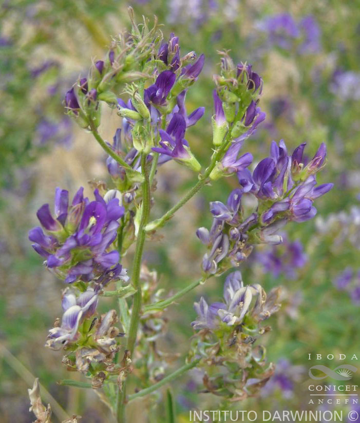 Planta herbácea, perenne, erecta o ascendente. Raíz gruesa, profunda. Rizomas bre¬ves, con o sin raíces adventicias. Yemas de renuevo formando una corona subleñosa, su¬perficialmente enterrada. Tallo de 25-130 cm alt. Folíolos de 2-4 x 0,5-2 cm, obovados, oblongos a lanceolados, los inferiores a veces orbiculares, truncados, emarginados, den¬tados en el tercio superior, ± pubescentes en la cara abaxial, rara vez en la adaxial. Estí¬pulas de 12-18 mm, lanceoladas a subuladas, subenteras o dentadas en la base, pilosas. Racimos 6-50-floros; cabezuela elipsoide. Flores de 10-12 mm, azules, violetas o blancas. Cáliz de 6-8 mm, pubescente; dientes triangulares, más largos que el tubo calicino. Vexi¬lo de 10-11 x 4-5,5 mm, oblongo a obovado, emarginado; alas de ± 9 mm carina de 7-8 mm. Ovario recto, piloso, 10-12-ovulado. Legumbre de 4-7 mm, inerme, discoide, forma¬da por 2-3 espiras, suavemente reticulada, nervio dorsal marcado. Semilla de 2,5-3 mm, angulosa a reniforme, lisa.