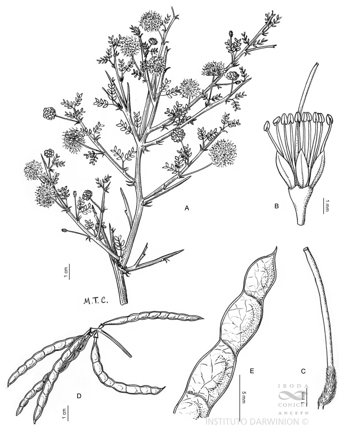 Arbustos de 0,5-1 m de altura, ramas hornótinas rígidas, flexuosas, de 1-3 mm de diámetro en la base, no punzantes, dispuestas a 45º-70º respecto de su eje portador, pubescencia no adpresa. Estípulas de 1-2 mm long., espinosas, persistentes, rectas a recurvadas, divergentes, pubescentes, con glándulas basales hemisféricas. Hojas pubescentes; pecíolo de 0,2-2 mm long.; glándula circular y sésil; pinnas de 0-2 mm long., con un folíolo o hasta con 3 pares de folíolos, éstos de 0,5 –2 x 0,5-1 mm, crasos, de contorno elíptico. Capítulos con 23-27 flores, de 8-15 mm de diámetro; pedúnculo de 5-13 mm long., pubescente; brácteas de contorno espatulado a lanceolado, cuculadas, hirsutas en el envés. Andromonoecia funcional. Flores sésiles. Cáliz de 0,5-2 mm long., en vivo blanco, castaño hacia el ápice, craso, cupuliforme a tubular, hirsuto; corola de 3-4 mm long., en vivo pétalos blancos, verdes hacia los márgenes y crasos, rectos, incurvos en el ápice, pilosos en la mitad distal del hipófilo; androceo de 3,5-6 mm long., en vivo filamentos blancos, anteras de contorno elíptico, conectivo verde; ovario rojo en vivo, seríceo, estilo curvo. Lomentos, 1-4 por infrutescencia, de 60-75 x 3-4 mm, péndulos, de márgenes rectos, pubescencia patente, castaño opaco; artejos, 14-15 por lomento, de 4-5 x 3-5 mm, con umbos de contorno semicircular vistos desde la sutura, desprovistos de crestas. Granos de polen 3- colporados o 3-4-sincolporados, esféricos a oblatos. Ámbito semiangular. Exina verrucada, perforada (perforaciones de 0,47 µm de diámetro) y perfosulada (fósulas de 1,52 µm long.). Membrana del colpo lisa, de márgenes verrucados y granulados; membrana del “os” granulada. Apocolpio verrucado o inexistente (en los granos sincolporados)
