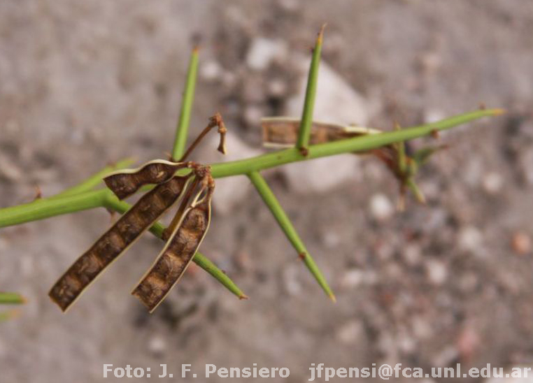 Arbustos de 0,5-1 m de altura, ramas hornótinas rígidas, flexuosas, de 1-3 mm de diámetro en la base, no punzantes, dispuestas a 45º-70º respecto de su eje portador, pubescencia no adpresa. Estípulas de 1-2 mm long., espinosas, persistentes, rectas a recurvadas, divergentes, pubescentes, con glándulas basales hemisféricas. Hojas pubescentes; pecíolo de 0,2-2 mm long.; glándula circular y sésil; pinnas de 0-2 mm long., con un folíolo o hasta con 3 pares de folíolos, éstos de 0,5 –2 x 0,5-1 mm, crasos, de contorno elíptico. Capítulos con 23-27 flores, de 8-15 mm de diámetro; pedúnculo de 5-13 mm long., pubescente; brácteas de contorno espatulado a lanceolado, cuculadas, hirsutas en el envés. Andromonoecia funcional. Flores sésiles. Cáliz de 0,5-2 mm long., en vivo blanco, castaño hacia el ápice, craso, cupuliforme a tubular, hirsuto; corola de 3-4 mm long., en vivo pétalos blancos, verdes hacia los márgenes y crasos, rectos, incurvos en el ápice, pilosos en la mitad distal del hipófilo; androceo de 3,5-6 mm long., en vivo filamentos blancos, anteras de contorno elíptico, conectivo verde; ovario rojo en vivo, seríceo, estilo curvo. Lomentos, 1-4 por infrutescencia, de 60-75 x 3-4 mm, péndulos, de márgenes rectos, pubescencia patente, castaño opaco; artejos, 14-15 por lomento, de 4-5 x 3-5 mm, con umbos de contorno semicircular vistos desde la sutura, desprovistos de crestas. Granos de polen 3- colporados o 3-4-sincolporados, esféricos a oblatos. Ámbito semiangular. Exina verrucada, perforada (perforaciones de 0,47 µm de diámetro) y perfosulada (fósulas de 1,52 µm long.). Membrana del colpo lisa, de márgenes verrucados y granulados; membrana del “os” granulada. Apocolpio verrucado o inexistente (en los granos sincolporados)