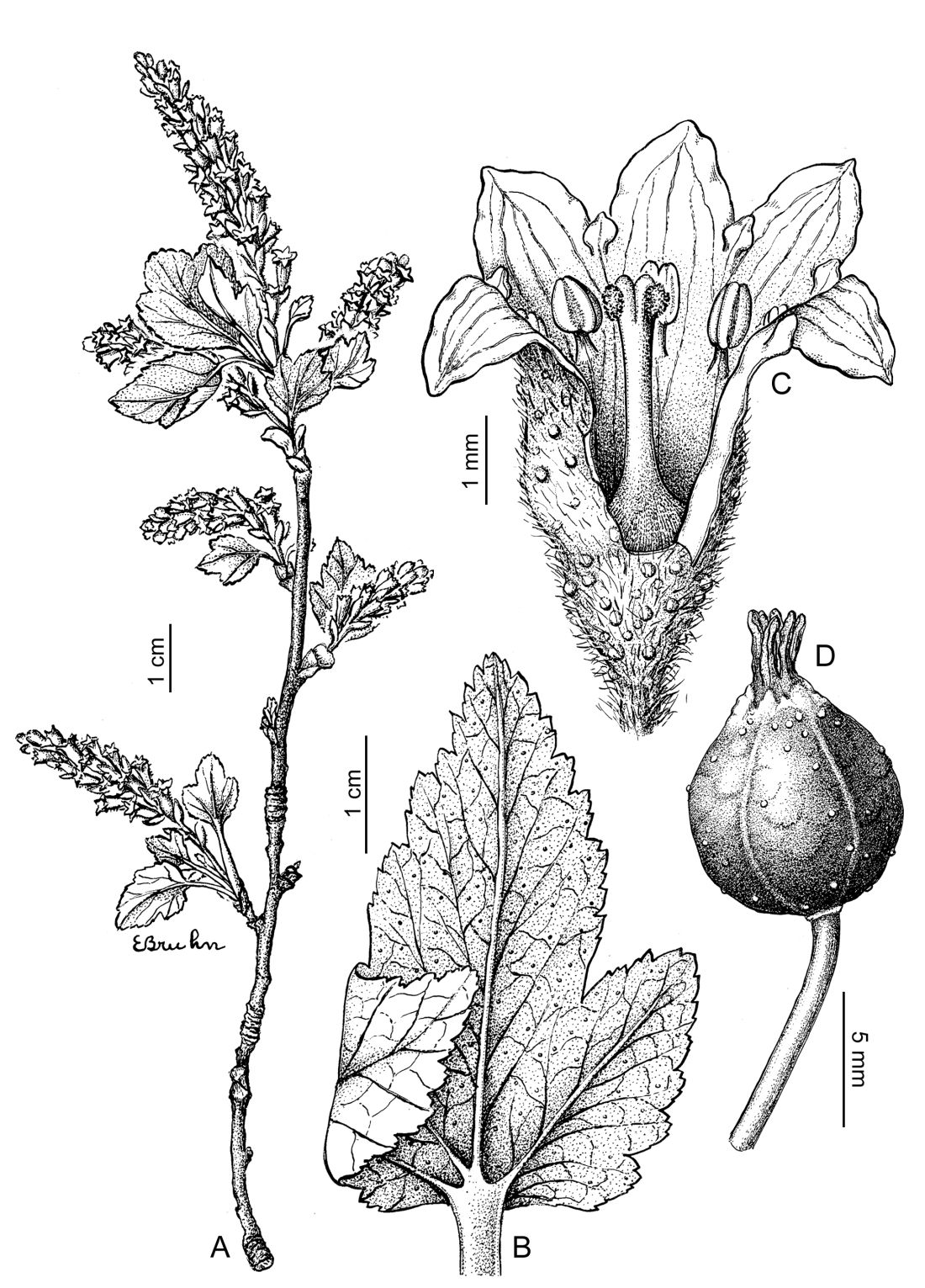 A. Rama florífera. B. Hoja, cara abaxial. C Flor con el cáliz desplegado. D. Fruto.