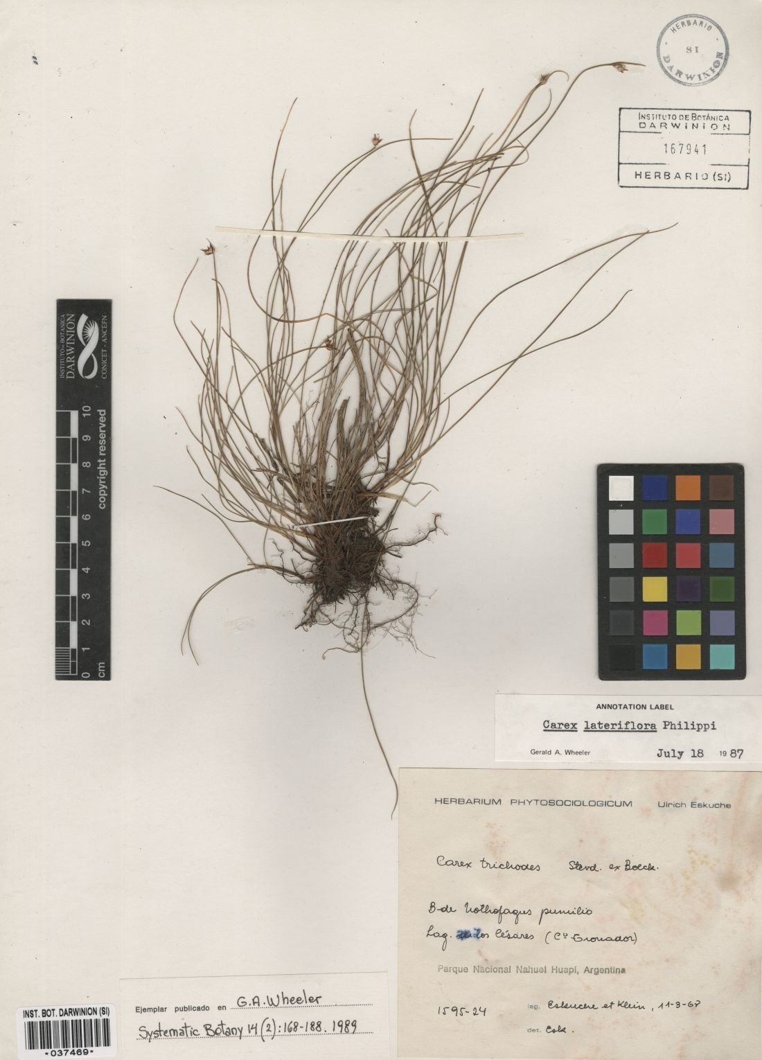 Carex lateriflora Phil. Anales Univ. Chile 93: 488. 1896 Carex involucrata Steud. ex Lechl., nom. nud. : . Carex trichodes Steud. ex Boott var. lateriflora (Phil.) Kük. var. lateriflora (Phil.) Kük. : . Carex trichodes Steud. ex Boott var. major Kük. var. major Kük. : .