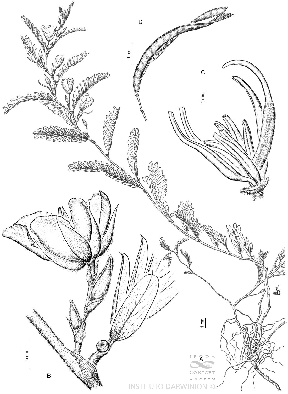 A. Planta. B. Nudo con estípulas, glándula peciolar e inflorescencia. C. Androceo y gineceo. D. Fruto.