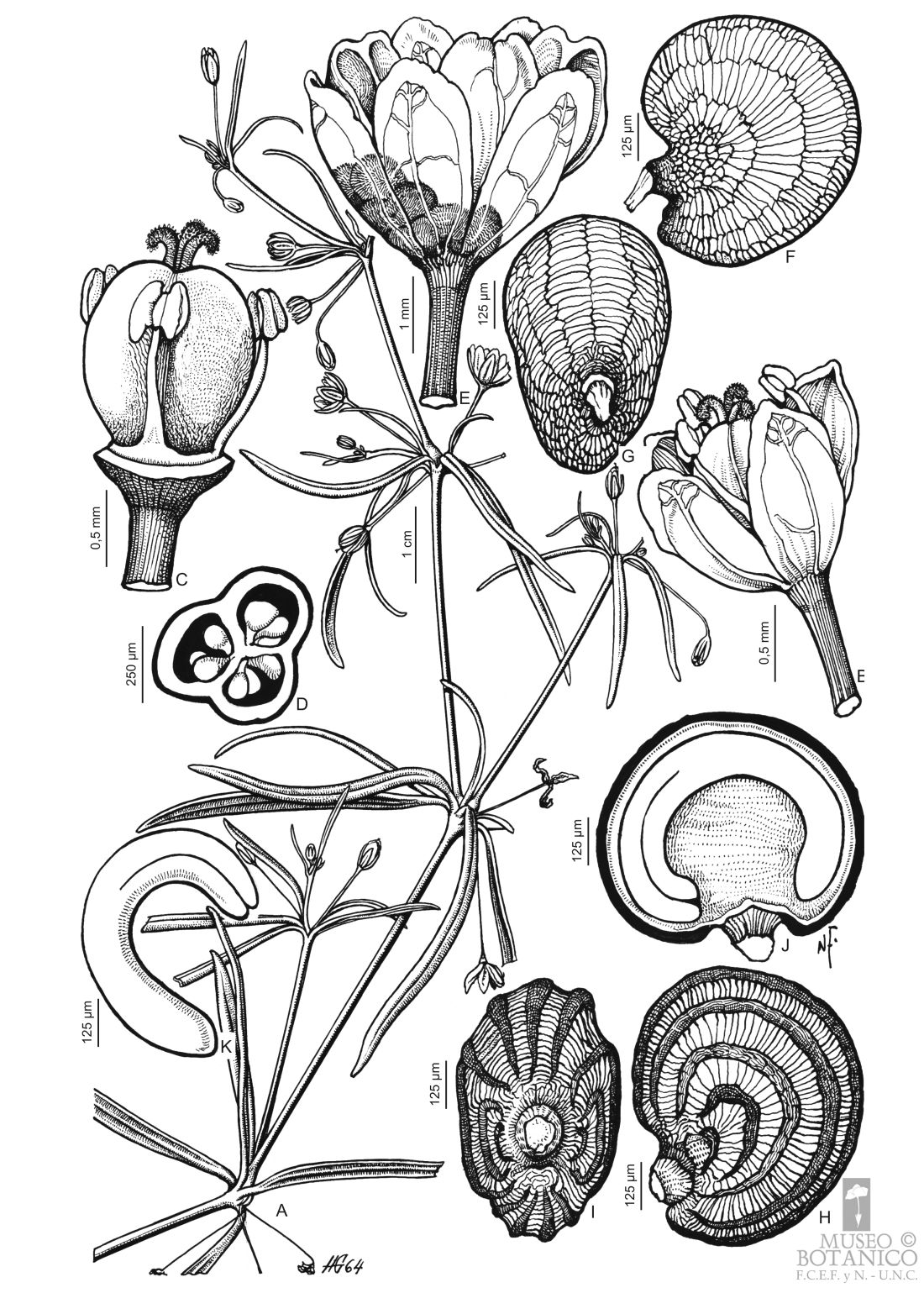 A. Rama. B. Flor. C. Androceo y gineceo. D. Transcorte por ovario. E. Fruto dehiscente. F-G. Semilla lisa, vistas lateral e hilar respect. H-I. Semilla con costillas, vistas lateral e hilar, respect. J. Corte longitudinal por semilla. K. Embrión.