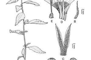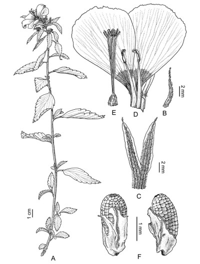 Sufrútice de 40-60 cm de alto, ramificado, con pelos simples; tallos con pelos gruesos, antrorsos y otros cortos y crespos; yemas axilares seriales, ramas seriales frecuentemente desarrolladas. Hojas herbáceas; estípulas de 0,4-0,7 mm de largo, pilosas; pecíolo semicilíndrico, de 5-13 mm de largo; nectarios 2 situados en la unión de pecíolo y lámina, circulares o elípticos; lámina ovada, elíptica o lanceolada, de 24-80 × 7-40 mm, haz con pelos largos y cortos, envés con pelos sobre las venas prominentes, borde crenado-aserrado, ápice agudo, raramente obtuso. Flores solitarias, epifilas, homostilas; pedúnculo de 4-9 mm de largo, totalmente adnato al pecíolo; pedicelo ausente; profilos 2, opuestos, insertos en la base del cáliz, subulados o lanceolados, de 4-15 × 0,6-2 mm; cáliz de 12-17 mm de largo, tubo calicino de 3,5-7 mm de largo, cara externa con pelos largos, antrorsos y pelos cortos, crespos; lóbulos del cáliz triangulares o lanceolados, bordes internos membranáceos, ápice mucronado; corola rotácea, de 26-55 mm de diámetro, pétalos obovados, marfilinos, con mácula morada en la base de borde superior dentado; filamentos estaminales complanado-subulados, amarillos, de 6-13 mm de largo, insertos en la base del tubo floral, porción basal soldada por los bordes a la uña de los pétalos, formando bolsillos nectaríferos; anteras sub-basifijas, anaranjadas, de 3-4 mm de largo, recurvadas a la dehiscencia; ovario ovoide, de 1,5-2,5 mm de largo, con pelos cortos, adpresos; estilos amarillos de 8-12 mm de largo, con algunos pelos; estigmas penicilados, amarillos, de 1-2 mm de largo. Frutos angustiovoides, de 5-8 mm de diámetro, cara externa tuberculada, con pelos adpresos y otros cortos, cara interna glabra, lustrosa. Semillas obovoides, de 2,5-3 × 0,9-1,2 mm, negruzcas a la madurez, reticuladas, aréolas cuadrangulares; arilo unilateral, amplio, más corto que la semilla.
