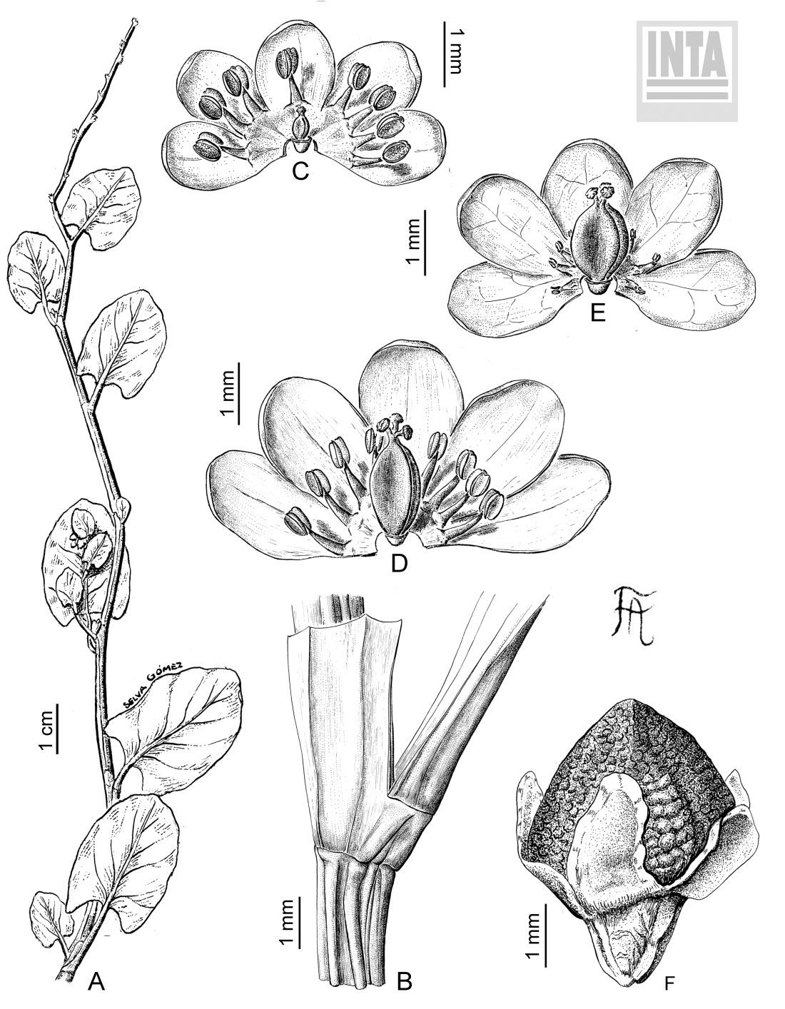 A. Porción de una rama. B. Detalle de la ócrea. C. Flor estaminada. D.Flor perfecta. E. Flor pistilada. F. Aquenio.