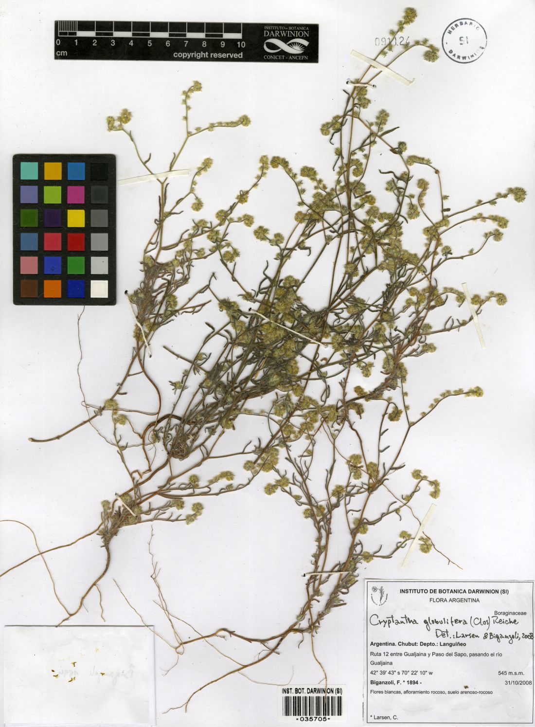 Observaciones: De acuerdo a Ariza Espinar (2006), Cryptantha globulifera habita en la provincia de La Pampa. El único material identificado como tal por el autor revela, sin embargo, que pertenece a C. patagonica. Protólogo alternativo: Fl. Chile 5: 232. 1910.