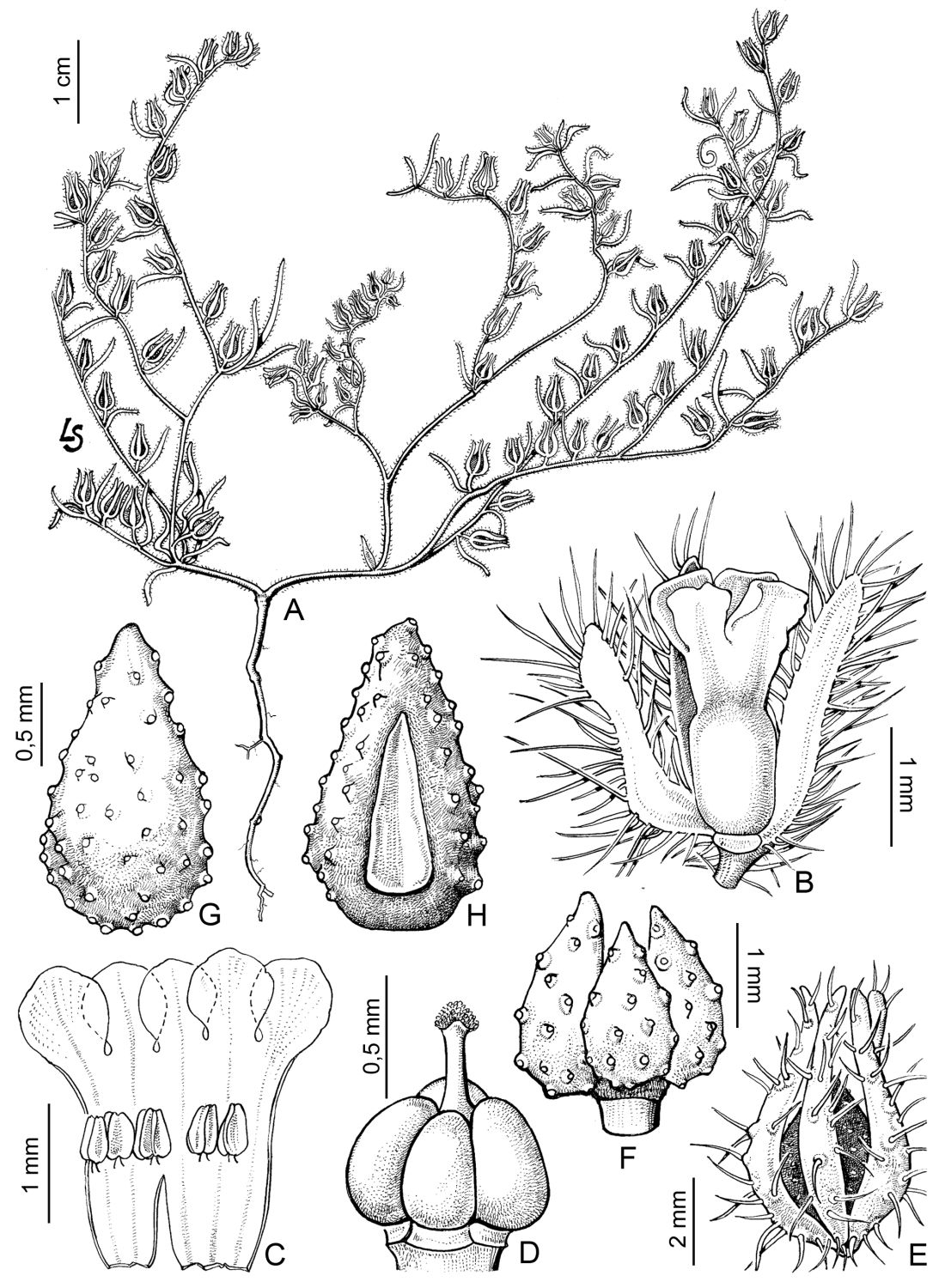 Hierbas anuales, hasta de 20 cm de alto; tallos ascendentes o algo decumbentes, muy ramificados, hirsutos con tricomas de base pustulosa. Hojas sésiles; lámina linear, en ocasiones oblanceolada, de 1-3 × 0,1-0,3 cm, estrigosa en ambas superficies con tricomas de base pustulosa, ápice agudo, en ocasiones obtuso, base truncada. Flores casmógamas subsésiles, en cincinos simples, bracteados; cáliz campanulado, de 2-3 mm de largo, hirsuto en el margen e híspido a lo largo del nervio medio de los lóbulos, lóbulos lineares o linear-lanceolados; corola blanca, tubular, con tubo de 2-3 mm de largo, limbo de 1-1,5 mm de diámetro, lo´bulos obovados; anteras subsésiles, ca. 0,4 mm de largo; ovario 4-lobado. Fruto formado por (2-3-)4 clusas ovoideo-tri´gonas, de 1,5-2,5 cm de largo, heteromorfas, inclusas en el cáliz fructífero, blanco-grisa´ceas, cara dorsal con la superficie finamente granulada y con numerosos tube´rculos; ginobase piramidal.