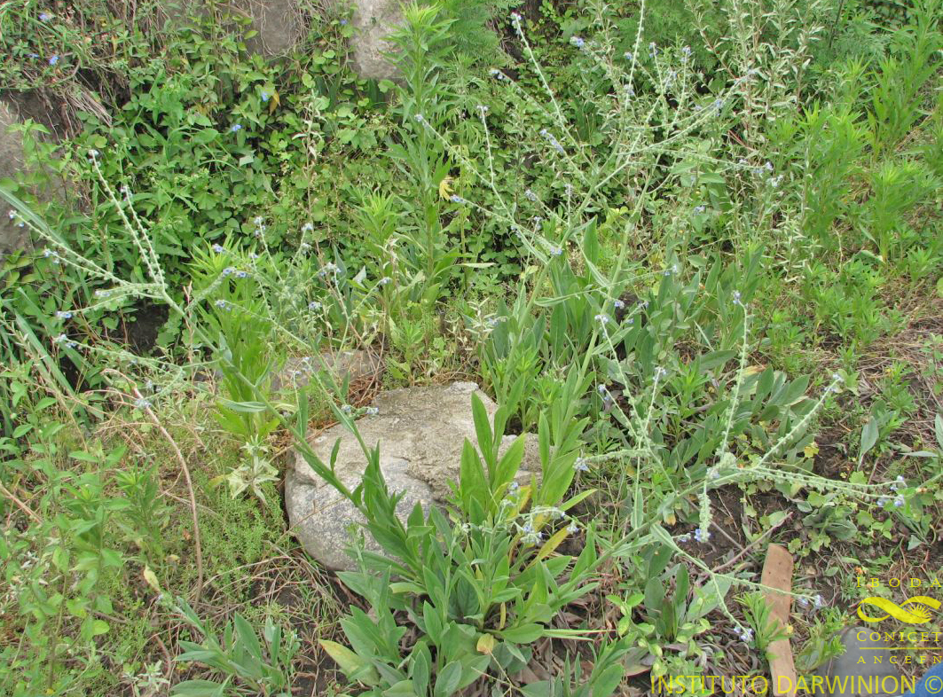 Hierbas anuales hasta de 1 m de alto, densamente seríceas, en ocasiones híspidas. Hojas con la lámina oblanceolada o elíptico-lanceolada, de 3-25 × 0,7-7 cm, membranácea, serícea en ambas superficies, con tricomas de base pustulosa en la superficie adaxial, base decurrente u obtusa. Inflorescencias en cincinos paniculados, ebracteados. Flores subsésiles con pedicelo hasta de 2 mm de largo; cáliz viloso, en ocasiones piloso, de 2-3 mm de largo, con 5 lóbulos ovados; corola celeste, con tubo de 2-2,5 mm de largo, limbo de 8-12 mm de diámetro. Clusas con el exocarpo dorsal con gloquidios escasos, rodeado por un margen con gloquidios más densos. Número básico de cromosomas x = 12.