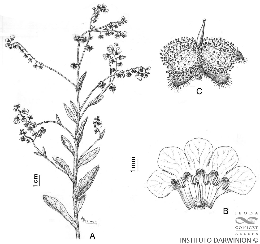 Hierbas anuales hasta de 1 m de alto, densamente seríceas, en ocasiones híspidas. Hojas con la lámina oblanceolada o elíptico-lanceolada, de 3-25 × 0,7-7 cm, membranácea, serícea en ambas superficies, con tricomas de base pustulosa en la superficie adaxial, base decurrente u obtusa. Inflorescencias en cincinos paniculados, ebracteados. Flores subsésiles con pedicelo hasta de 2 mm de largo; cáliz viloso, en ocasiones piloso, de 2-3 mm de largo, con 5 lóbulos ovados; corola celeste, con tubo de 2-2,5 mm de largo, limbo de 8-12 mm de diámetro. Clusas con el exocarpo dorsal con gloquidios escasos, rodeado por un margen con gloquidios más densos. Número básico de cromosomas x = 12.