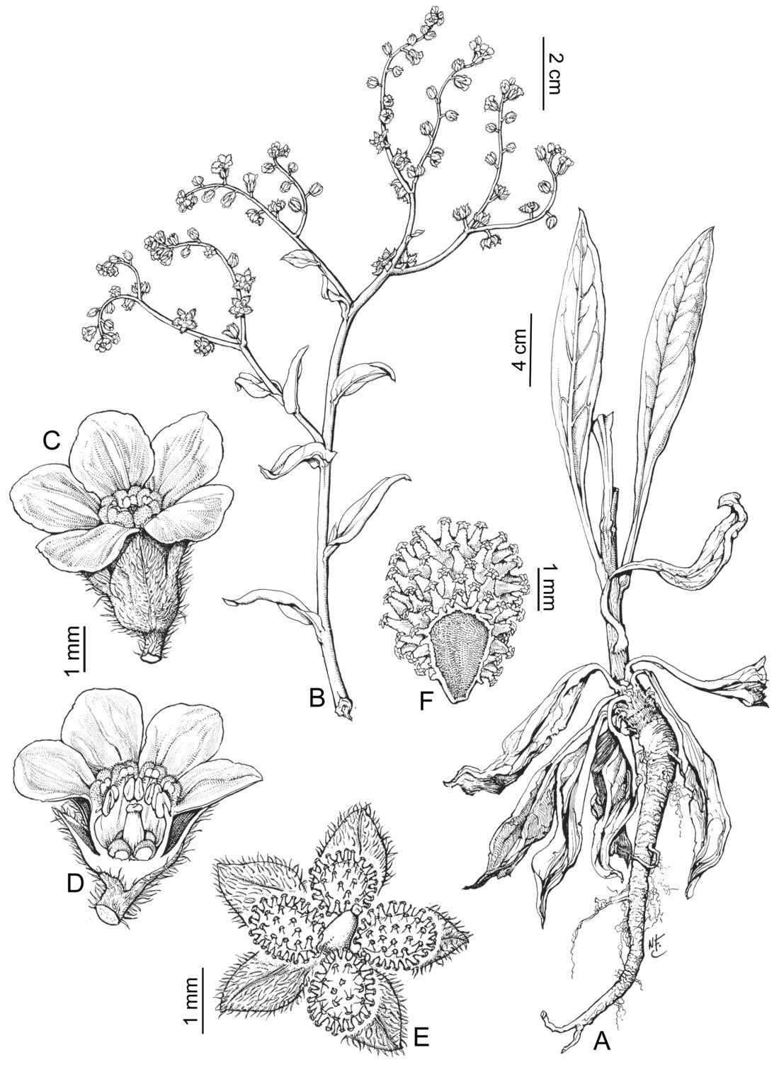 A-B. Planta. C. Flor. D. Cáliz y corola desplegados con androceo y gineceo. E. Vista apical del fruto. F. Detalle del exocarpo de una clusa.