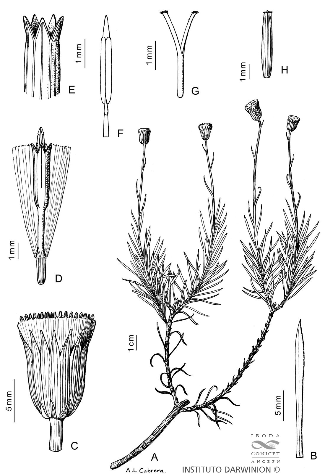 A. Rama florífera. B. Hoja. C. Capítulo. D. Flor. E. Ápice de la corola. F. Estambre. G. Porción superior del estilo. H. Aquenio.