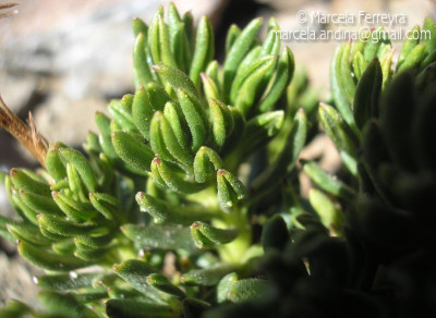 Sufrútices ramosos, de 15-20 cm de alto, glabros; tallos ascendentes o erectos, densamente hojosos en la parte inferior y casi desnudos en la superior. Hojas sésiles, alternas en la parte superior, linear-oblongas, de 8-17 × 1,5-2,5 mm, ligeramente estrechadas en la base, obtusas en el ápice, enteras y algo engrosadas en el margen, crasas, glabras en ambas caras. Capítulos discoides, solitarios en el ápice del tallo. Involucro acampanado, de 7-9 × 8-10 mm; brácteas del calículo lanceoladas, cortas; filarios ca. 13, oblongo-lanceolados, subobtusos, penicilados y oscuros en el ápice, glabros en el dorso. Flores isomorfas, numerosas, con corolas amarillas, tubulosas, de 6,5-8,5 mm de largo, cortamente 5-lobadas, lóbulos triangulares, de 0,5-0,7 mm de largo. Aquenios cilindroides, ca. 4 mm de largo, costados, glabros. Papus blanco de 6-7,5 mm de largo