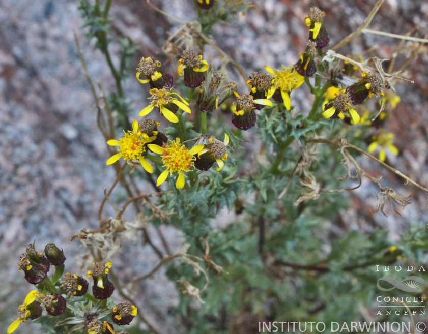 Arbustitos de 8-60 cm de alto, glabros; tallos muy ramificados, densamente hojosos hasta el ápice. Hojas alternas, sésiles, oblongas u oblongo-espatuladas, de 10-26 × 5-10 mm, profunda y agudamente espinuloso-dentadas o lobuladas, con 5-8 dientes o lóbulos triangulares a cada lado, algo carnosas. Capítulos radiados, dispuestos de 2-4 en cimas corimbiformes en los ápices de las ramitas; pedúnculos bractéolados, de 4-15 mm de largo. Involucro acampanado, de 7-8 × 7-11 mm; brácteas del calículo lineares que alcanzan la mitad de la altura del involucro o algo más; filarios 12-13, linear-lanceolados, agudos, con una bolsa oleífera linear a lo largo del dorso, glabros. Flores dimorfas, las del margen 4-7, con corolas amarillas, cortamente liguladas, lígula elíptica, de 3,5-5 × 1-1,8 mm; las del centro numerosas, con corolas tubulosas, ca. 6 mm de largo, cortamente 5-lobadas, lóbulos estrechamente triangulares, ca. 0,5 mm de largo. Aquenios cilindroides, ca. 3 mm de largo, costados, glabros. Papus blanco de 3,5-6 mm de largo.