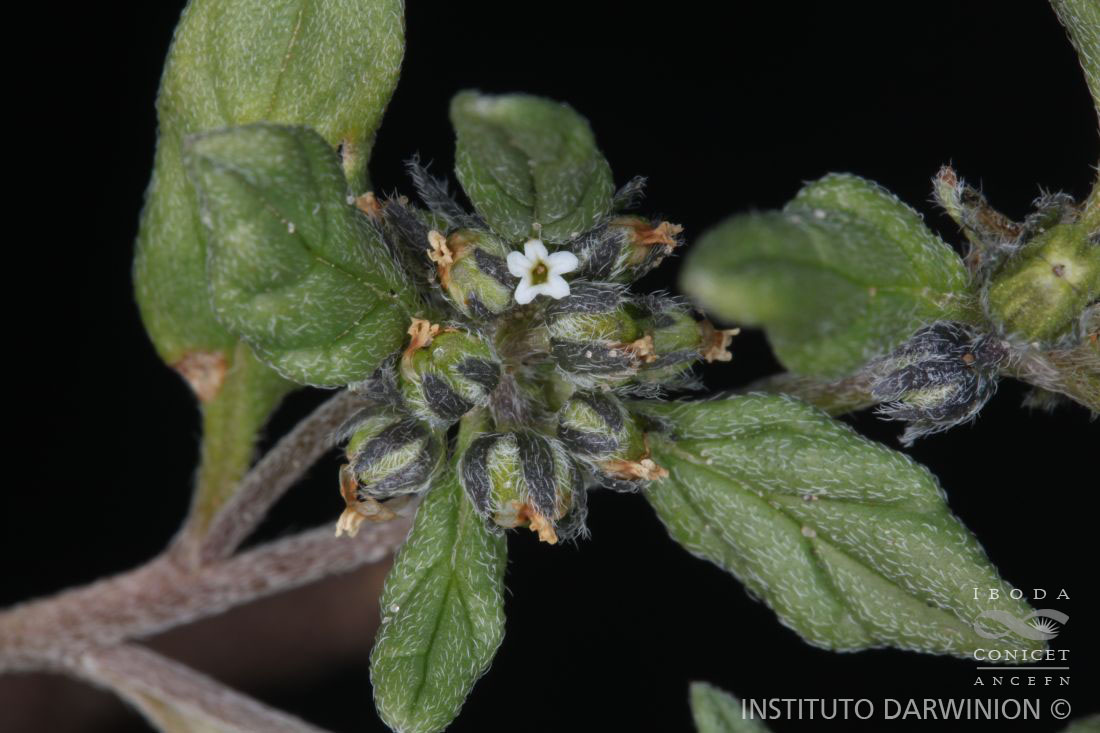 Hierba anual o bianual hasta de 50 cm de alto, estrigosa; ramas procumbentes. Hojas alternas o subopuestas; pecíolos de 2-10 mm de largo; láminas ovado-elípticas, de 0,4-4 × 0,2-1,5 cm, estrigosas, cartáceas, ápice agudo, base aguda, el margen revoluto. Inflorescencias globuloriformes, de 1,5 cm de largo, sésiles, formadas por cincinos breves, paucifloros, con 1-10 flores. Flores con cáliz de 1,5-2 mm de largo, lacinias triangulares, el ápice agudo, híspidas; corola infundibuliforme blanca, tubo de 2 mm de largo, exterior e interiormente glabro, limbo de 1 mm de diámetro, lóbulos redondeados; anteras elipsoidales, de 0,4 mm de largo; ovario ca. 0,75 mm de largo, estigma pubescente con reborde basal suave. Fruto subgloboso, de 2,5-3 ×2,5-3 mm, glabro, dividido a la madurez en 2 mericarpos 2-seminados.