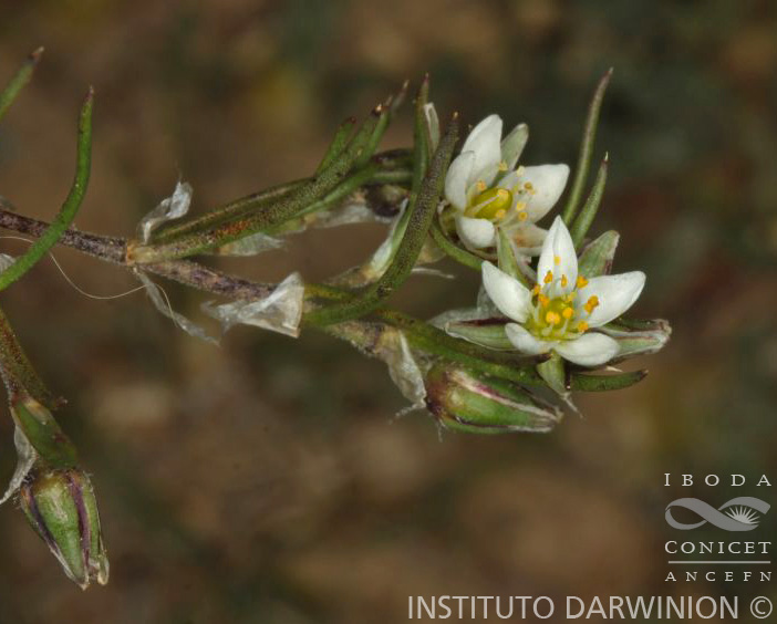 Hierba perenne; raíz pivotante leñosa; tallos erectos, ramificados, de 2-30 cm de alto, generalmente cespitosas, glandulosos-pubescentes en la porción apical y hacia la base con un indumento más ralo, a veces glabrescentes o glabros. Hojas generalmente fasciculadas, linear-filiformes, de 6-40 × 0,3-1,2 mm, mucronadas, glandulosas-pubescentes o glabras; estipulas triangular-lanceoladas, de 2-8 mm de largo, acuminadas, a veces laceradas en el ápice, connadas o casi libres. Inflorescencia en cimas dicotómicas laxas, glanduloso-pubescentes, glabrescentes o glabras; brácteas de 1-8(-15) mm de largo, las inferiores foliáceas y las superiores escariosas; pedicelos filiformes, de 1-10 mm de largo, glandulosos-pubescentes, reflexos o erectos; sépalos ovados a lineal-lanceolados, de 3-5 mm de largo, agudos, carenados o no, mucronados o no, márgenes angostos, blancos o a veces teñidos de púrpura, glandulosos-pubescentes o glabrescentes con algunos tricomas al menos en la base, a veces glabros; pétalos ovado-lanceolados, de 0,6-1,6(-5) mm de largo, ápice subagudo a redondeado, blancos, a veces rosados; estambres 7-10; estilos 3, de 0,4-0,7 mm de largo, connados en la base. Fruto una cápsula de 4-6 mm de largo, dehiscente hasta la base; pedicelos fructíferos filiformes, de 5-18 mm de largo, reflexos, glanduloso-pubescentes. Semillas piriformes, de 0,4-0,9 mm de largo, levemente rugoso-punteadas, densamente papilosas, con las papilas de la misma tonalidad que la testa o ausentes, rodeadas de un ala dentado-fimbriada, de 0,2-0,3 mm de ancho, o a veces con alas vestigiales muy angostas de un solo lado de la semilla, o semillas marginadas sin alas, pardo-oscuras, casi negras, a veces castañas.