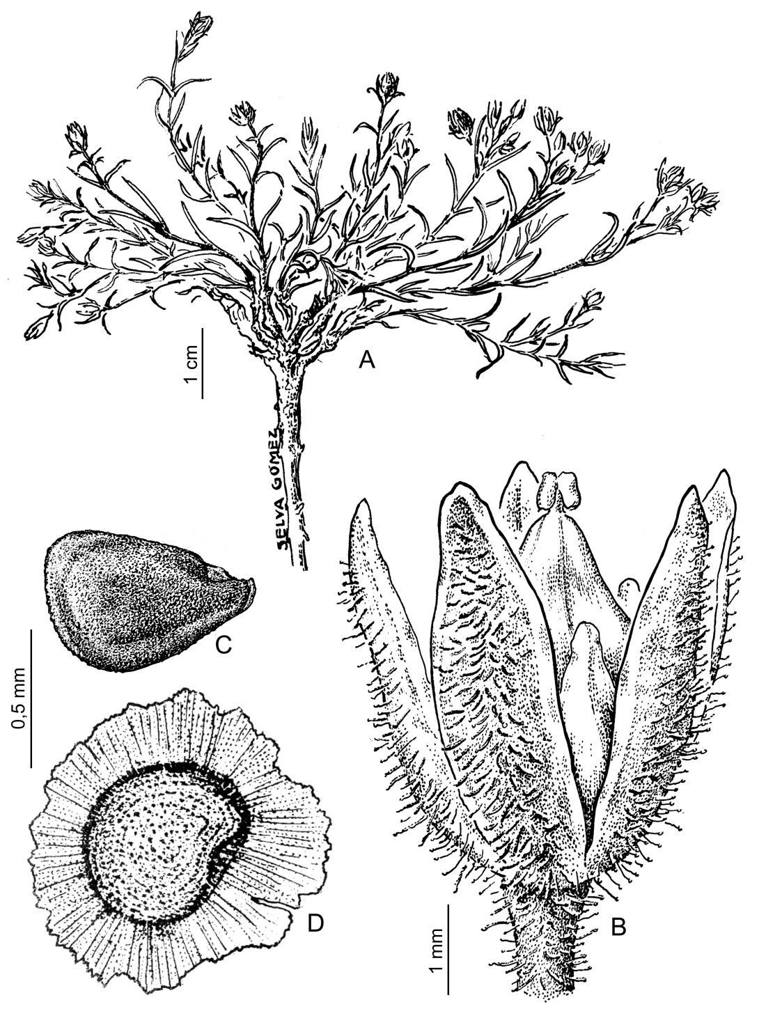Hierba perenne; raíz pivotante leñosa; tallos erectos, ramificados, de 2-30 cm de alto, generalmente cespitosas, glandulosos-pubescentes en la porción apical y hacia la base con un indumento más ralo, a veces glabrescentes o glabros. Hojas generalmente fasciculadas, linear-filiformes, de 6-40 × 0,3-1,2 mm, mucronadas, glandulosas-pubescentes o glabras; estipulas triangular-lanceoladas, de 2-8 mm de largo, acuminadas, a veces laceradas en el ápice, connadas o casi libres. Inflorescencia en cimas dicotómicas laxas, glanduloso-pubescentes, glabrescentes o glabras; brácteas de 1-8(-15) mm de largo, las inferiores foliáceas y las superiores escariosas; pedicelos filiformes, de 1-10 mm de largo, glandulosos-pubescentes, reflexos o erectos; sépalos ovados a lineal-lanceolados, de 3-5 mm de largo, agudos, carenados o no, mucronados o no, márgenes angostos, blancos o a veces teñidos de púrpura, glandulosos-pubescentes o glabrescentes con algunos tricomas al menos en la base, a veces glabros; pétalos ovado-lanceolados, de 0,6-1,6(-5) mm de largo, ápice subagudo a redondeado, blancos, a veces rosados; estambres 7-10; estilos 3, de 0,4-0,7 mm de largo, connados en la base. Fruto una cápsula de 4-6 mm de largo, dehiscente hasta la base; pedicelos fructíferos filiformes, de 5-18 mm de largo, reflexos, glanduloso-pubescentes. Semillas piriformes, de 0,4-0,9 mm de largo, levemente rugoso-punteadas, densamente papilosas, con las papilas de la misma tonalidad que la testa o ausentes, rodeadas de un ala dentado-fimbriada, de 0,2-0,3 mm de ancho, o a veces con alas vestigiales muy angostas de un solo lado de la semilla, o semillas marginadas sin alas, pardo-oscuras, casi negras, a veces castañas.