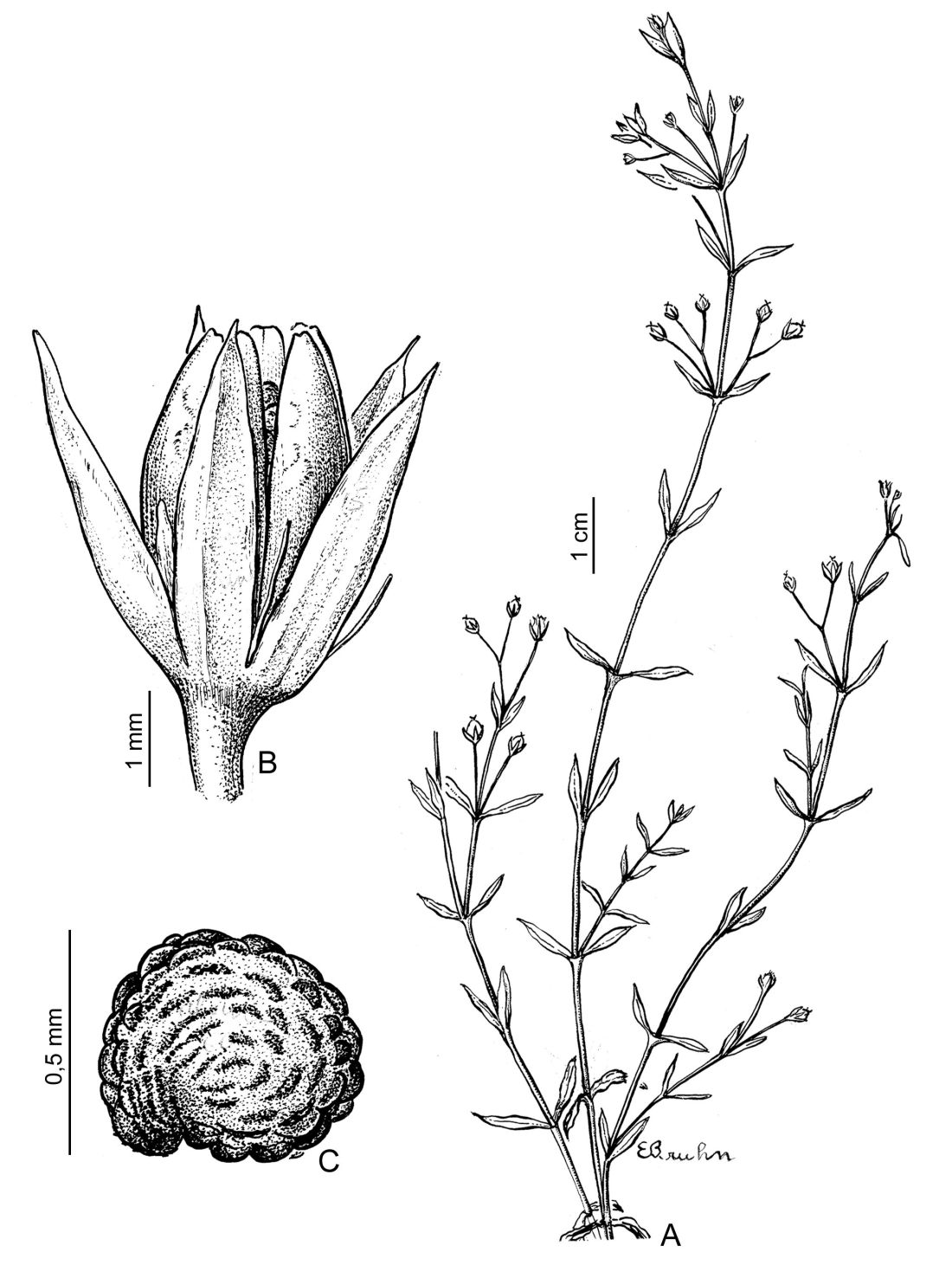 Hierba perenne; tallos ascendentes, 4-angulares, de 15-20(-30) cm de largo, ramificados, glabros. Hojas sésiles, angostamente elípticas a oblanceoladas, de 0,5-1,8(-2,8) × 0,1-0,7 cm, agudas, de base cuneada, esparcidamente ciliadas hacia la base, glabras en el resto de la superficie. Flores solitarias o en cimas dicotómicas de 3-5 flores, terminales o axilares; pedicelo de 0,4-1,8 cm de largo, glabro; brácteas lanceoladas, de 3-6 mm de largo, agudas, escariosas; sépalos 5, lanceolados, de 2,5-3,5 mm de largo, agudos, glabros; pétalos 5, de 1,5-3 mm de largo, a veces nulos, hendidos hasta cerca de la base; estambres 10; estilos 3, ca. 1 mm de largo. Fruto una cápsula ovoide a orbicular-ovoide, de 2,5-3,5 mm de largo, 6-valvar. Semillas numerosas, reniformes, de 0,3-0,8 mm de díámetro, rugulosas.