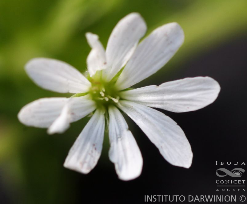 Hierba anual, rastrera o apoyante, laxa, de 2-50 cm de alto, tallos teretes, pubescentes a glabrescentes. Hojas ovadas, a veces cordiformes, de 8-34 x 2,5-19 mm, las inferiores pecioladas y las superiores sésiles, ciliadas o glabras. Inflorescencias en dicasios laxos, terminales; entrenudos y pedicelos acrescentes después de la antesis hasta de 20-25 mm de largo; brácteas herbáceas; sépalos ovados, de ápice subagudo, de 3,0-4,5 mm de largo, con el nervio medio evidente, algunas veces terminado en un punto oscuro, márgenes internos membranosos, hialinos, pubescentes o glabros; pétalos iguales o menores que los sépalos, 2-partidos hasta cerca de la base, con el margen externo de los lóbulos convexos, interno recto; estambres (0-)2-3(-5), alternipétalos, con nectarios en la base; anteras amarillas o violáceas; estilos 3, de 0,8-1,2 mm de largo. Fruto una cápsula mayor que el cáliz, de 4-5 mm de largo, dehiscente por 6 valvas. Semillas de ca. 1 mm de diámetro, numerosas, con tubérculos redondeados, pardo-rojizas.