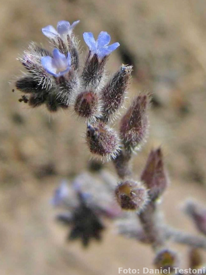 Hierbas anuales, hasta de 30 cm de alto, ramosas, erguidas, rosuladas; tallos seríceos con tricomas antrorsos, uncinados en la base. Hojas alternas, sésiles, en ocasiones pseudopecioladas; lámina lanceolada u oblonga, de 0,7-2 × 0,2-0,5 cm, escabrosa o serícea en ambas superficies, con tricomas uncinados en la vena media abaxial, ápice obtuso, en ocasiones apiculado, base atenuada o truncada. Inflorescencias en cimas racemiformes, ebracteadas. Flores con pedicelos hasta de 1,6 mm de largo en antesis/fructificación; cáliz campanulado, actinomorfo, con tricomas uncinados, de 2-2,2 mm de largo en antesis, hasta de 4 mm de largo en fructificación, lóbulos lanceolados con ápice agudo; corola azul o violácea, con tubo de 2,5-3 mm de largo, limbo de 2,8-3,5 mm de diámetro. Clusas ca. 1,5 mm de largo.