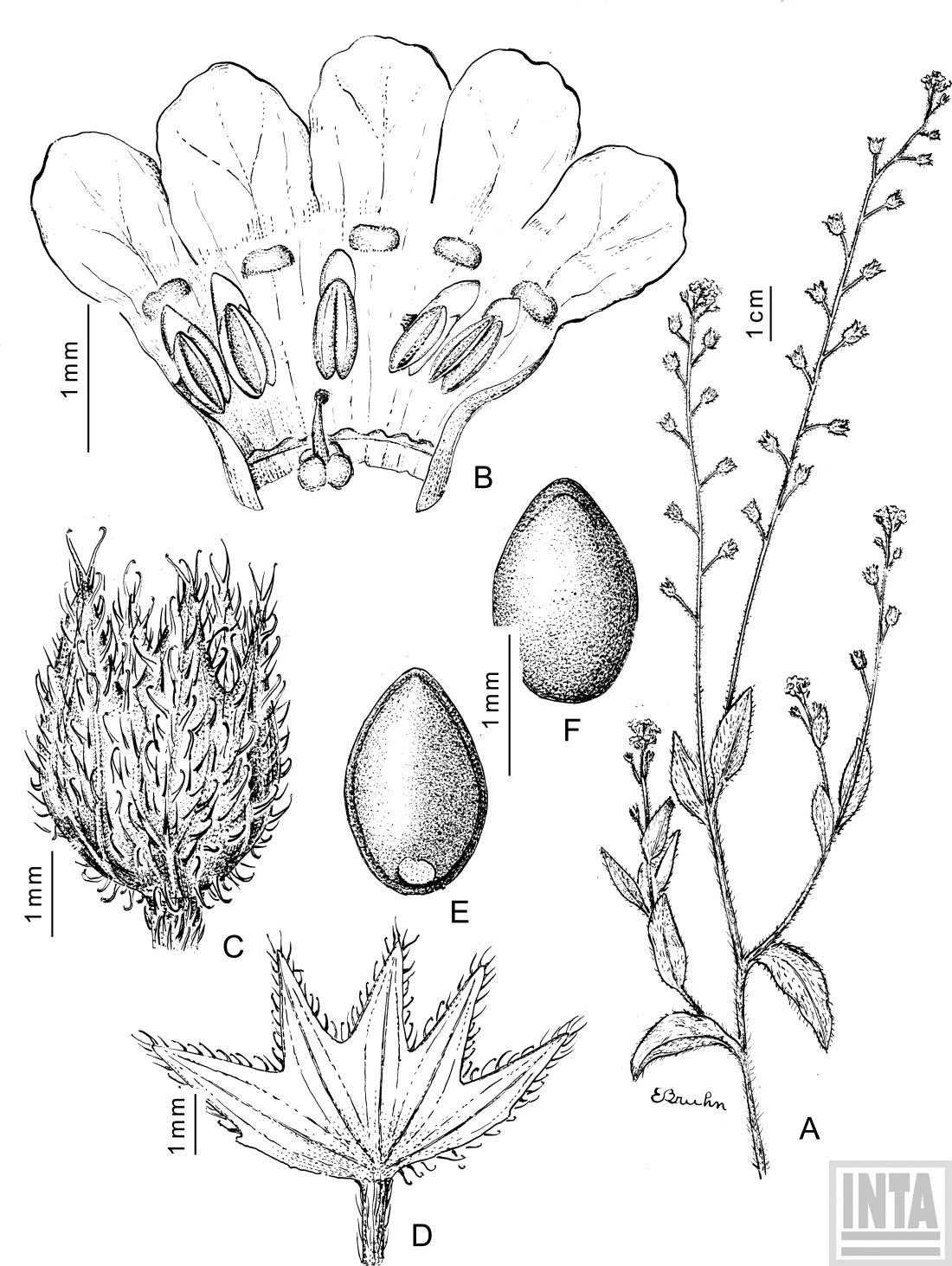Hierbas anuales o bienales, hasta de 40 cm de alto, ascendentes o erectas, rosuladas; tallos híspidos. Hojas alternas, dimórficas, las inferiores más extensas y pseudopecioladas, las apicales sésiles; lámina oblanceolada u oblonga, de 0,3-1(5) × 0,02-0,08 cm, la superficie adaxial escabrosa con tricomas de base pustulosa, en ocasiones estrigosa o serícea, superficie abaxial serícea, ápice apiculado, base atenuada u obtusa. Inflorescencias cimosas, bracteadas. Flores con pedicelos hasta de 2 mm de largo en antesis/fructificación; cáliz campanulado, zigomorfo (3+2), con tricomas uncinados, de 1,5-2,5 mm de largo en antesis, hasta de 7 mm de largo en fructificación, lóbulos triangulares con el ápice agudo; corola blanca, con tubo de 1,8-2 mm de largo, limbo de 1-2(-2,5) mm de diámetro. Clusas de 1,5-2 mm de largo.