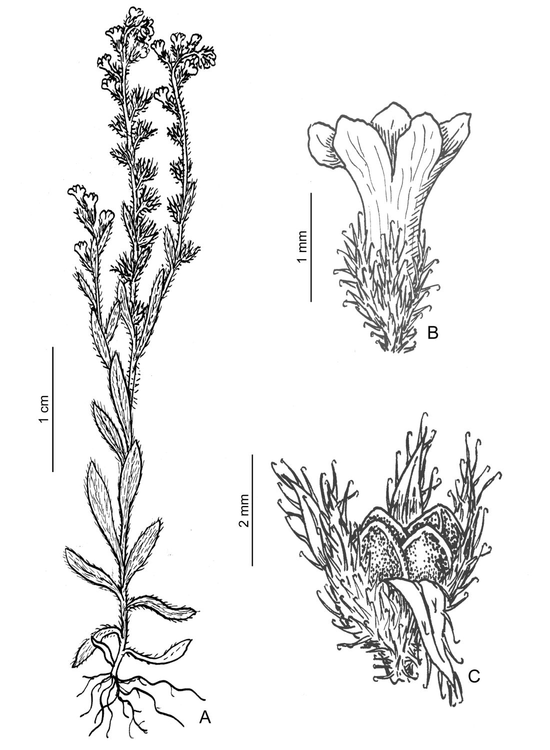 Hierbas anuales o bienales, hasta de 40 cm de alto, ascendentes o erectas, rosuladas; tallos híspidos. Hojas alternas, dimórficas, las inferiores más extensas y pseudopecioladas, las apicales sésiles; lámina oblanceolada u oblonga, de 0,3-1(5) × 0,02-0,08 cm, la superficie adaxial escabrosa con tricomas de base pustulosa, en ocasiones estrigosa o serícea, superficie abaxial serícea, ápice apiculado, base atenuada u obtusa. Inflorescencias cimosas, bracteadas. Flores con pedicelos hasta de 2 mm de largo en antesis/fructificación; cáliz campanulado, zigomorfo (3+2), con tricomas uncinados, de 1,5-2,5 mm de largo en antesis, hasta de 7 mm de largo en fructificación, lóbulos triangulares con el ápice agudo; corola blanca, con tubo de 1,8-2 mm de largo, limbo de 1-2(-2,5) mm de diámetro. Clusas de 1,5-2 mm de largo.