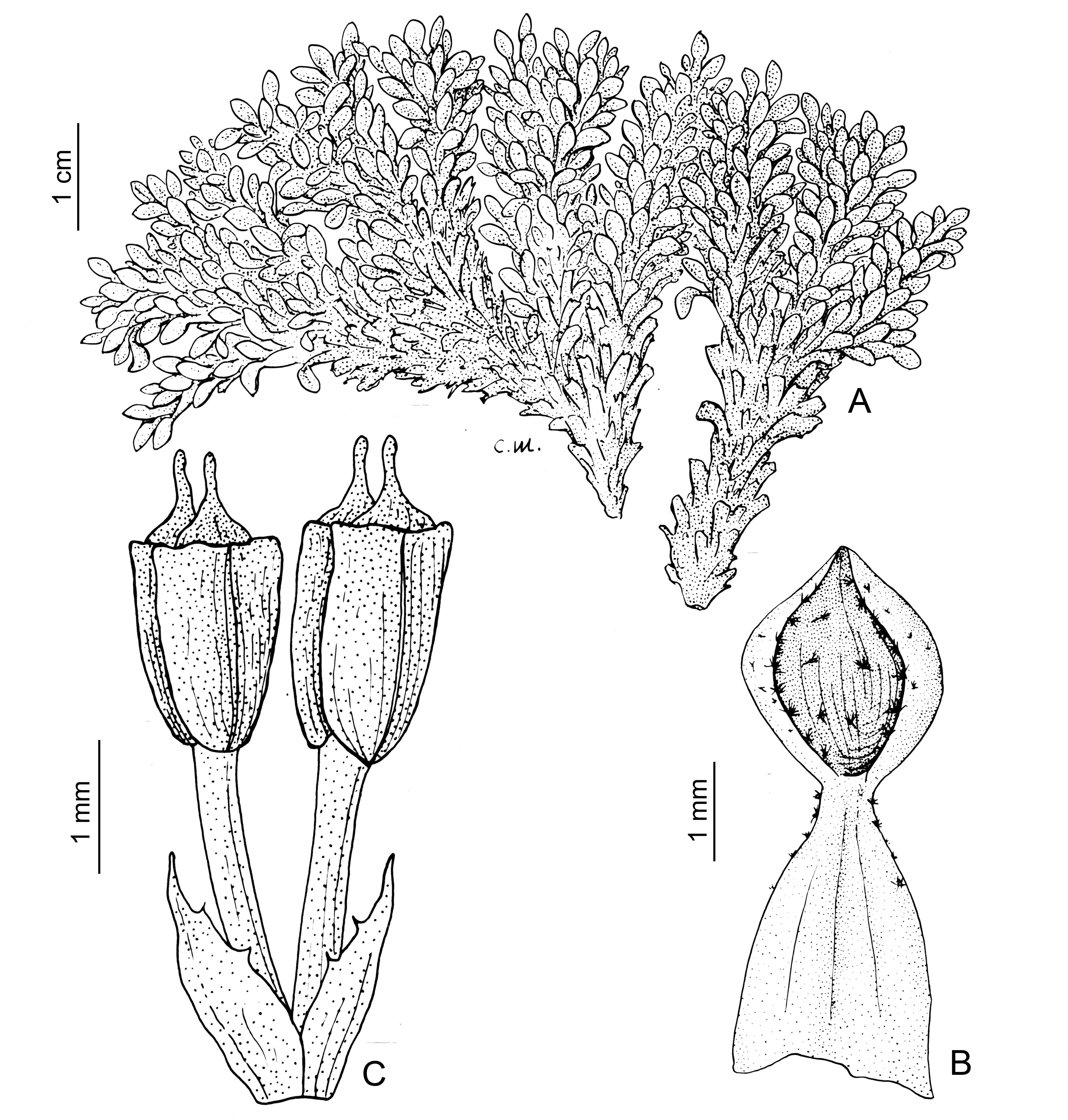 A. Fragmento del cojín. B. Hoja. C. Umbela fructífera