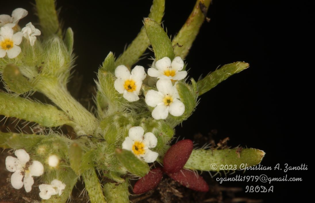 Hierba hasta de 20 cm de alto, erecta y postrada en las ramas laterales, estrigosa. Hojas opuestas y alternas, sésiles; lámina linear, de 3-15 (35) × 1-2 mm, no intrincada, estrigosa, ápice obtuso, base obtusa, el margen entero. Inflorescencias en pseudoespigas laxas a la madurez, densos cuando jóvenes, bracteadas. Flores subsésiles; cáliz de 2-2,5 mm de largo, densamente estrigoso, lóbulos 5, oblongo lineares, obtusos; corola tubular, blanca, tubo de 2,5-3 mm de largo, limbo ca. 2-2,5 mm de diámetro, lóbulos redondeados; anteras insertas en el tubo corolino por encima del estigma. Fruto con 4 clusas, o menos por aborto, inclusas en el cáliz fructífero, exocarpo rugoso, cara dorsal reticulada sin cresta, cara ventral con cresta tenue que termina en la cicatriz basal.