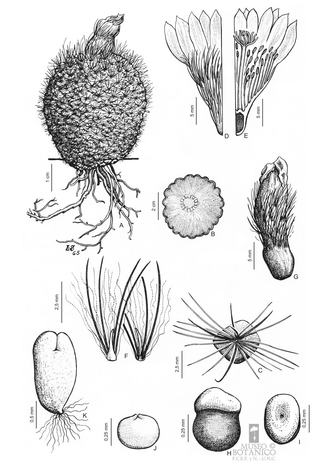 A. Hábito. B. Transcorte por tallo. C. Aréola del tallo. D-E. Flor (vista externa y corte longitudinal respect. F. Aréola floral mostrando la bráctea y los pelos y espinas axilares. G. Fruto. H-I. Semillas, vista lateral e hilar respect. J. Embrión. K. Plántula de 16 días .
