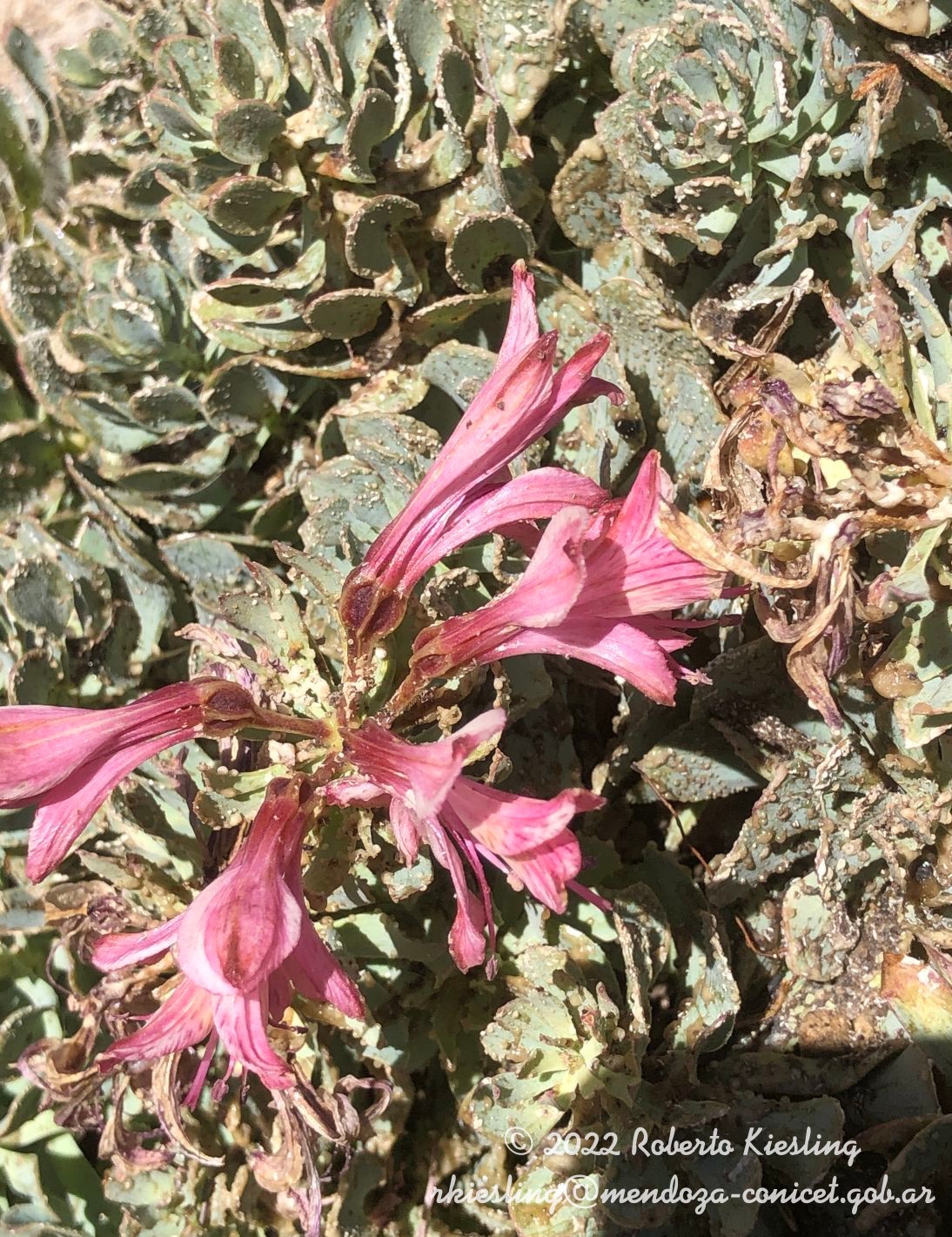 Plantas de 6-8 cm de alto. Rizoma flexuoso. Tallos en general breves sobre la superficie del suelo, erguidos, 1-4-floros. Hojas de 12-30 x 3-15 mm, con frecuencia rosuladas, espatuladas, coriáceas, en los bordes papiloso-denticuladas. Inflorescencia 1-4-radiada; radios casi siempre unifloros. Flores amarillas cernuas o casi erguidas. Ovario obovoide-truncado, de 4-9 x 3,9-6 mm. Perigonio de 23-40 mm. Tépalos unguiculados, libres hasta la base, los exteriores de 27-38 x 11-16 mm, los interiores de 23-40 x 5-6 mm. Estambres aproximadamente de la misma longitud del perigonio o algo menores; anteras de 1,8-2,7 mm. Estilo de la misma longitud que los estambres, brevemente trífido.