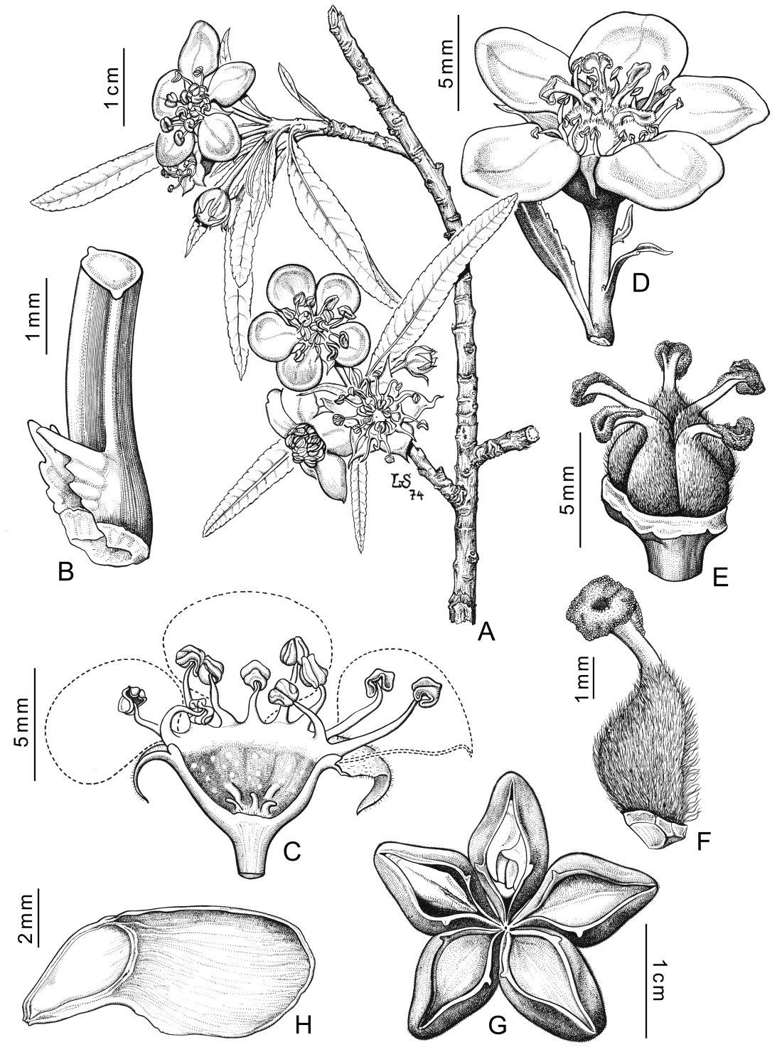 A. Rama florífera. B. Estípulas. C. Flor, corte longitudinal. D. Flor, vista lateral. E. Gineceo. F. Pistilo. G. Polifolículo. H. Semilla.
