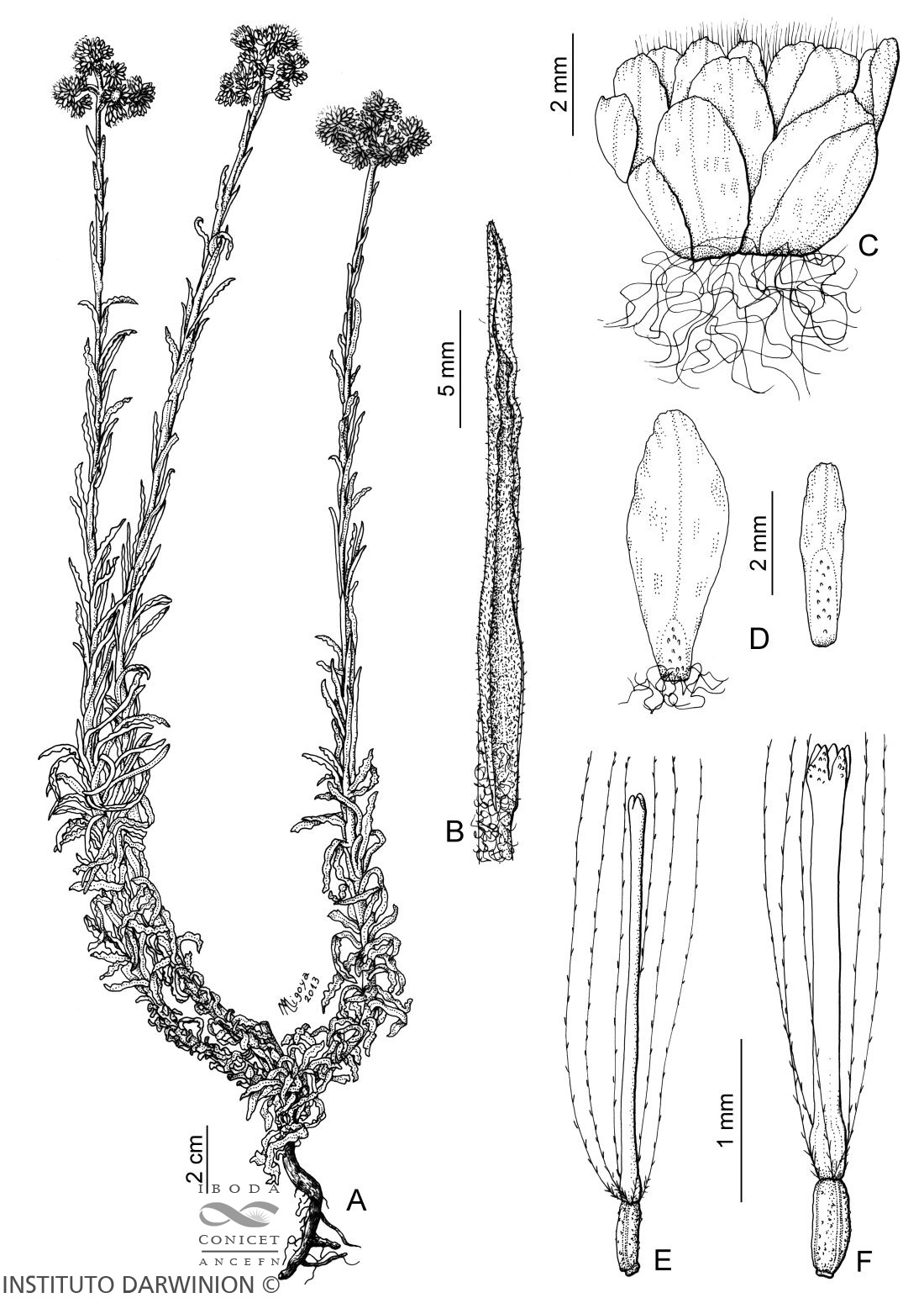 A. Planta. B. Hoja, con detalle de la pubescencia. C. Capítulo. D. Filarios. E. Flor del margen. F. Flor del centro.