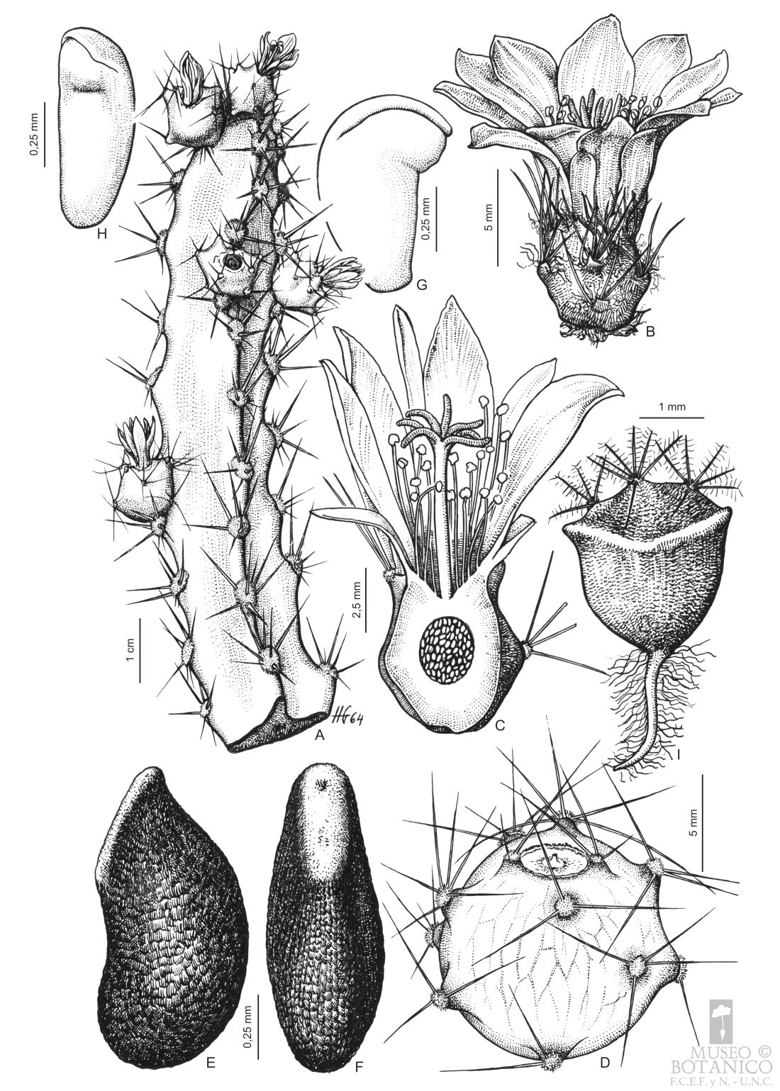 A. Sector apical del tallo. B. Flor, vista lateral. C. Corte longitudinal de flor (nótese la ausencia del hipanto y la inserción de los estambres). D. Fruto globoso y translúcido, obsérvense las espinas rígidas de las areolas. E-F. Semilla, vista lateral e hilar, respect. G-H. Embrión encorvado (incumbente), vistas lateral y frontal. I. Plántula.