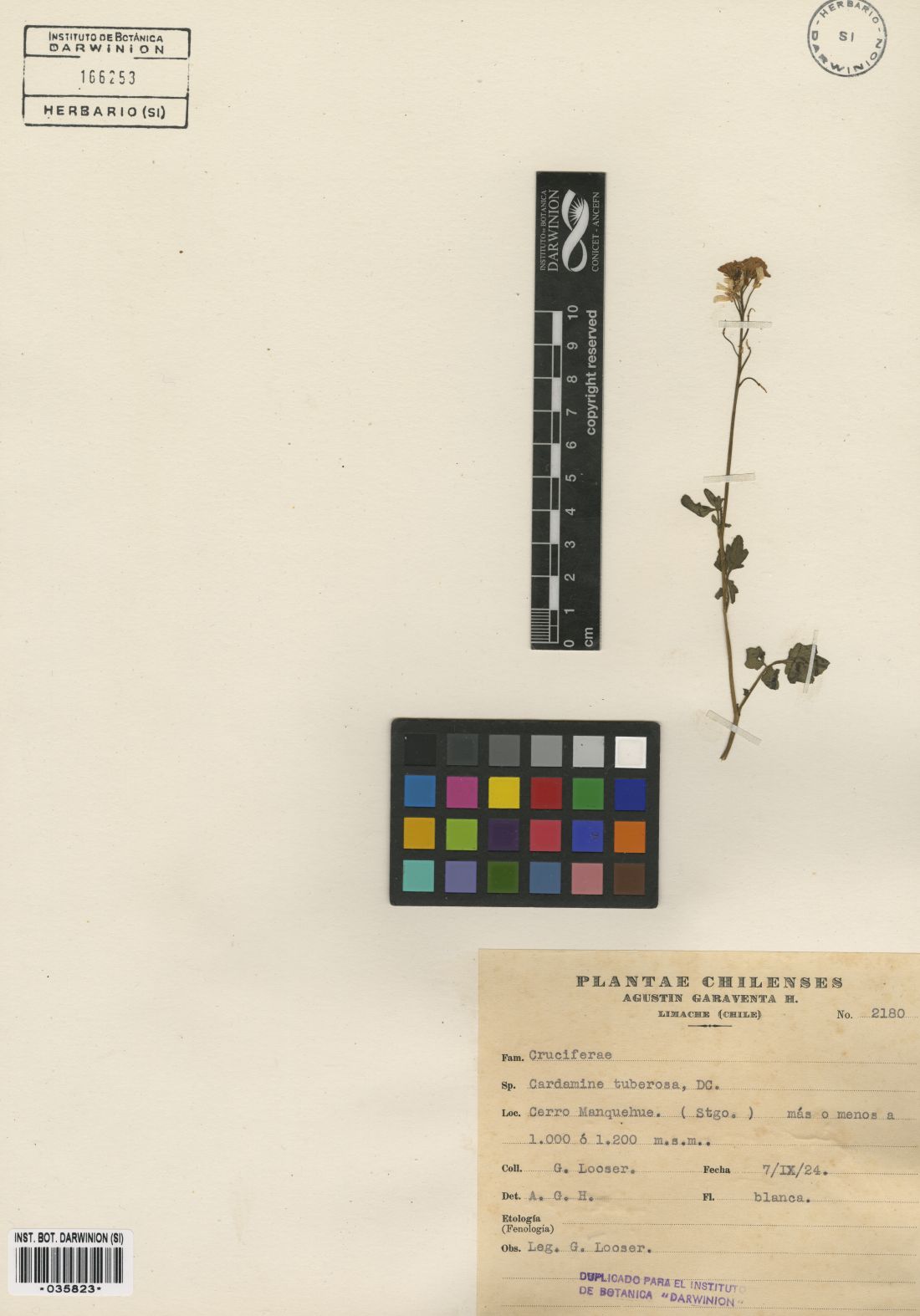 Observaciones: Tal como se mencionó para Cardamine rostrata, no se ha podido observar ningún material de C. tuberosa colectado recientemente en la Argentina; el único registro disponible corresponde al tipo de C. tuberosa var. velutina colectado hace más de un siglo en la provincia de Chubut (ver arriba).