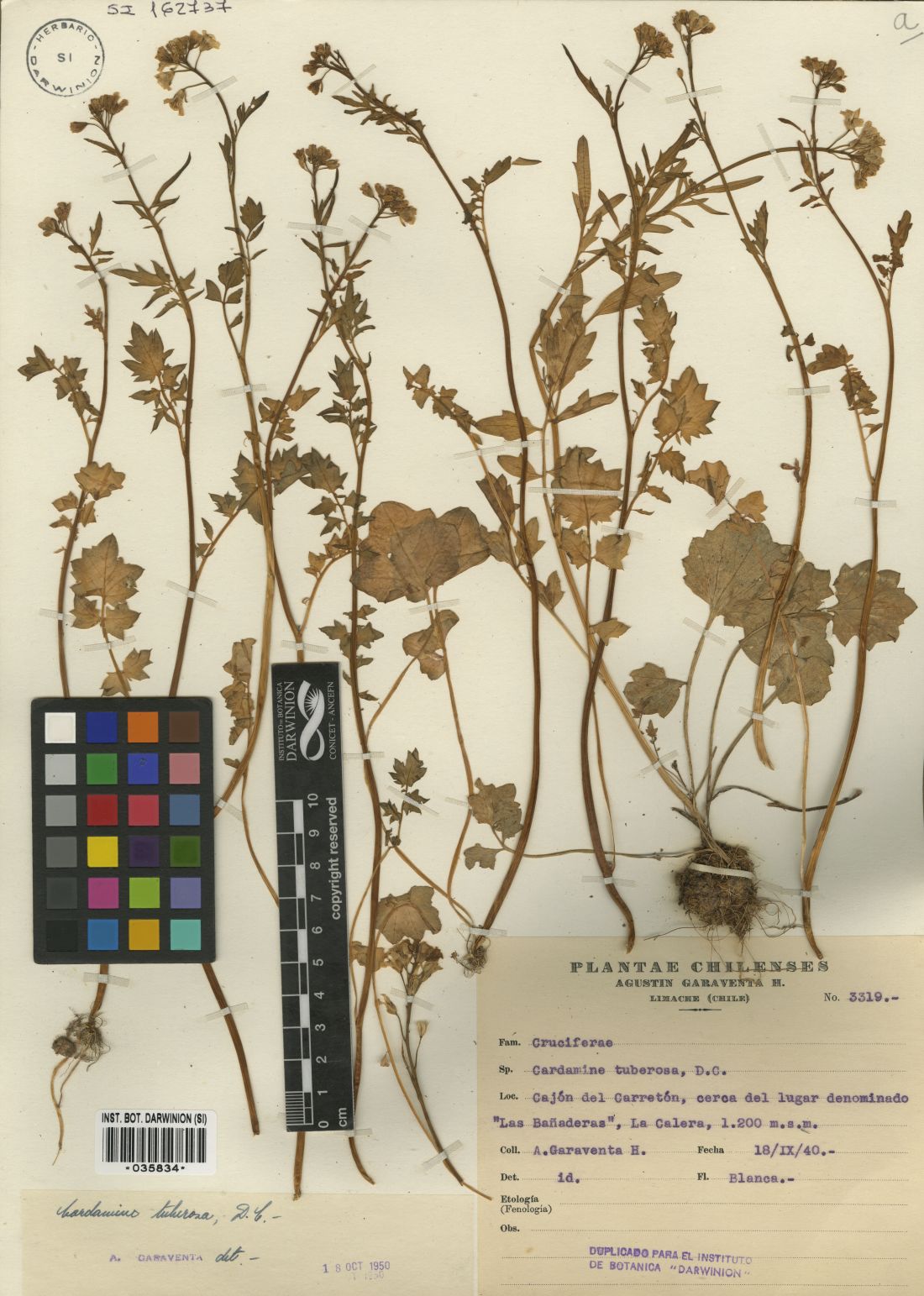 Observaciones: Tal como se mencionó para Cardamine rostrata, no se ha podido observar ningún material de C. tuberosa colectado recientemente en la Argentina; el único registro disponible corresponde al tipo de C. tuberosa var. velutina colectado hace más de un siglo en la provincia de Chubut (ver arriba).