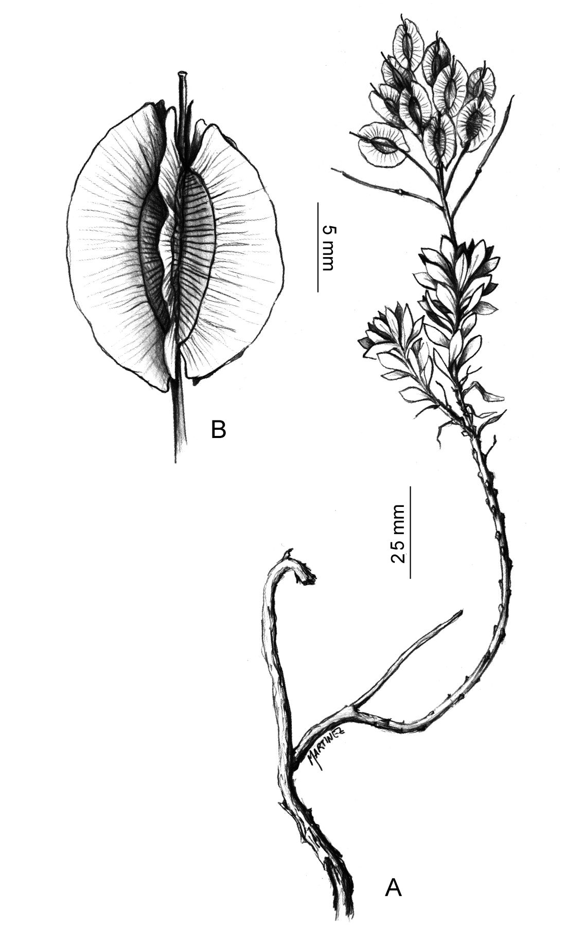 Sufrútices, caméfitos; con un cáudice leñoso y muy ramificado en la base. Tallos aéreos de 7-35 cm de alto, erectos a ascendentes, estramíneos, glabros o esparcidamente pilosos con tricomas simples, teretes y antrorsos, hasta de 0,7 mm largo, cubiertos con las bases de los pecíolos persistentes. Hojas sólo caulinares, pecioladas, no rosuladas; peciolos persistente, estramíneos; láminas enteras, espatuladas a obovadas, subcarnosas, de 10- 18 × 4-8(-10) mm, glabras o esparcida a densamente pilosas, cuneadas a atenuadas, margen entero, ápice agudo, generalmente umbonado. Racimos terminales, ebracteados, corimbosos, elongados en la fructificación, de 3-8 cm de largo; raquis piloso o glabrescente, recto; pedicelos fructíferos divaricado-ascendentes, rectos, de (0,9)-1,3-1,4(-2) cm de largo, usualmente pilosos. Sépalos oblongos, de 2,5-3,5(-4) × 1-2,5 mm, esparcidamente pilosos, levemente extendidos, no sacciformes, caducos, de margen escarioso; pétalos blanco-cremosos, espatulados a anchamente espatulados, de 4-6 × 1-2,5 mm, con uña diferenciada, glabros en la base; estambres levemente tetradínamos; filamentos libres, dilatados en la base y sin papilas, de 2-3,3 mm de largo; anteras angostamente oblongoides, de 1,5-1,6 mm largo; glándulas nectaríferas confluentes, rodeando la base de todos los filamentos. Frutos suborbiculares, glabros; valvas 3-aladas, con los nervios transversales conspicuos, frecuentemente con una de las valvas reducida; la valva desarrollada de 12-16 × 10-14 mm; alas de 2,5-3,5 mm de ancho, rectas o ligeramente onduladas; ginóforo de 2-4 mm largo, estilo de 2,5- 4(-6) mm de largo; estigma capitado, entero. Semillas de 4-4,5 × 2,5-3 mm, no aladas, aplanadas; cotiledones acumbentes.