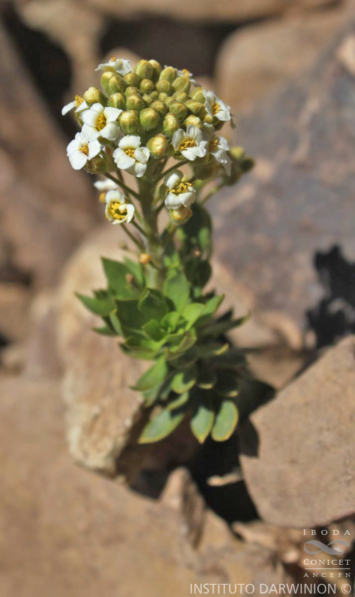 Sufrútices, caméfitos; con un cáudice leñoso y muy ramificado en la base. Tallos aéreos de 7-35 cm de alto, erectos a ascendentes, estramíneos, glabros o esparcidamente pilosos con tricomas simples, teretes y antrorsos, hasta de 0,7 mm largo, cubiertos con las bases de los pecíolos persistentes. Hojas sólo caulinares, pecioladas, no rosuladas; peciolos persistente, estramíneos; láminas enteras, espatuladas a obovadas, subcarnosas, de 10- 18 × 4-8(-10) mm, glabras o esparcida a densamente pilosas, cuneadas a atenuadas, margen entero, ápice agudo, generalmente umbonado. Racimos terminales, ebracteados, corimbosos, elongados en la fructificación, de 3-8 cm de largo; raquis piloso o glabrescente, recto; pedicelos fructíferos divaricado-ascendentes, rectos, de (0,9)-1,3-1,4(-2) cm de largo, usualmente pilosos. Sépalos oblongos, de 2,5-3,5(-4) × 1-2,5 mm, esparcidamente pilosos, levemente extendidos, no sacciformes, caducos, de margen escarioso; pétalos blanco-cremosos, espatulados a anchamente espatulados, de 4-6 × 1-2,5 mm, con uña diferenciada, glabros en la base; estambres levemente tetradínamos; filamentos libres, dilatados en la base y sin papilas, de 2-3,3 mm de largo; anteras angostamente oblongoides, de 1,5-1,6 mm largo; glándulas nectaríferas confluentes, rodeando la base de todos los filamentos. Frutos suborbiculares, glabros; valvas 3-aladas, con los nervios transversales conspicuos, frecuentemente con una de las valvas reducida; la valva desarrollada de 12-16 × 10-14 mm; alas de 2,5-3,5 mm de ancho, rectas o ligeramente onduladas; ginóforo de 2-4 mm largo, estilo de 2,5- 4(-6) mm de largo; estigma capitado, entero. Semillas de 4-4,5 × 2,5-3 mm, no aladas, aplanadas; cotiledones acumbentes.