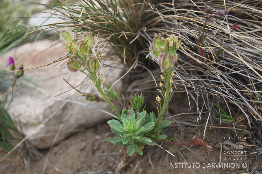 Sufrútices, caméfitos; con un cáudice leñoso y muy ramificado en la base. Tallos aéreos de 7-35 cm de alto, erectos a ascendentes, estramíneos, glabros o esparcidamente pilosos con tricomas simples, teretes y antrorsos, hasta de 0,7 mm largo, cubiertos con las bases de los pecíolos persistentes. Hojas sólo caulinares, pecioladas, no rosuladas; peciolos persistente, estramíneos; láminas enteras, espatuladas a obovadas, subcarnosas, de 10- 18 × 4-8(-10) mm, glabras o esparcida a densamente pilosas, cuneadas a atenuadas, margen entero, ápice agudo, generalmente umbonado. Racimos terminales, ebracteados, corimbosos, elongados en la fructificación, de 3-8 cm de largo; raquis piloso o glabrescente, recto; pedicelos fructíferos divaricado-ascendentes, rectos, de (0,9)-1,3-1,4(-2) cm de largo, usualmente pilosos. Sépalos oblongos, de 2,5-3,5(-4) × 1-2,5 mm, esparcidamente pilosos, levemente extendidos, no sacciformes, caducos, de margen escarioso; pétalos blanco-cremosos, espatulados a anchamente espatulados, de 4-6 × 1-2,5 mm, con uña diferenciada, glabros en la base; estambres levemente tetradínamos; filamentos libres, dilatados en la base y sin papilas, de 2-3,3 mm de largo; anteras angostamente oblongoides, de 1,5-1,6 mm largo; glándulas nectaríferas confluentes, rodeando la base de todos los filamentos. Frutos suborbiculares, glabros; valvas 3-aladas, con los nervios transversales conspicuos, frecuentemente con una de las valvas reducida; la valva desarrollada de 12-16 × 10-14 mm; alas de 2,5-3,5 mm de ancho, rectas o ligeramente onduladas; ginóforo de 2-4 mm largo, estilo de 2,5- 4(-6) mm de largo; estigma capitado, entero. Semillas de 4-4,5 × 2,5-3 mm, no aladas, aplanadas; cotiledones acumbentes.