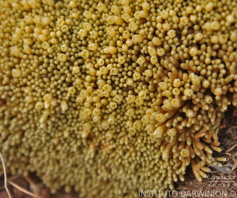 Arbustos irregulares, hasta de 50 cm de alto y 120 cm de diámetro; ramas compactas reunidas apretadamente, cilíndricas, amarillo pálidas a castañas. Hojas con lámina ovada a obovada, de 0,8-2 × 1,2-1,5 mm, ligeramente cimbiforme, recta a ligeramente curva, de ápice obtuso a redondeado o con un apículo de menos de 0,1 mm de largo, estramínea a castaño clara, con el margen notablemente expandido en una membrana translúcida y provista de un callo escarioso, elíptico a espatulado, de base decurrente, de posición media, abaxial, ocupando 1/2-2/3 de la longitud total de la lámina, estramíneo o anaranjado brillante; vaina de 0,7-1,2 mm de largo, estramíneo-translúcida. Flores con pedicelo hasta de 0,2 mm de largo y con 4 brácteas obovadas a obspatuladas, de 2-2,5 × 1,2-1,5 mm, de ápice obtuso a redondeado. Flor estaminada con sépalos ovados a obovados, de 2,5-3,8 × 1,8-2,2 mm, carinados a cimbiformes, de ápice obtuso a redondeado, ligeramente curvos, margen ligeramente involuto y membranáceo, escarioso en la porción media, cremosos a amarillo pálidos, superficie abaxial con un callo cubriendo ca. la mitad de la longitud del sépalo, amarillo claro a castaño oscuro; pétalos 5, oblongos a obovados, de 0,8-1,5(-2) × ca. 0,3 mm, de ápice obtuso, truncado-emarginado a irregularmente dentado, generalmente recurvado, translúcidos; estambres 5, de 1,9-2,2 mm de largo, los filamentos filiformes; pistilodio ligeramente turbinado, de 0,7-1,5 × 0,5-0,7 mm; disco plano, pobremente desarrollado. Flor pistilada con sépalos ovados a obovados, carinados a levemente cimbiformes, de 3-3,5 × 2,2-2,5 mm, de ápice obtuso a redondeado, ligeramente curvos, margen ligeramente involuto y membranáceo, medialmente escariosos, cremoso-claros a amarillo-pálidos, superficie abaxial con un callo cubriendo ca. la mitad de la longitud del sépalo, de color amarillo-claro a castaño-oscuro; pétalos 5, oblongos a obovados, de 1-1,2 × 0,2-0,3 mm, de ápice obtuso, truncado, emarginado a irregularmente dentado, generalmente recurvado, translúcidos; estaminodios 5, de 0,4-0,5 mm de largo, filamento subulado; disco presente, diminuto, aplanado; gineceo de (1,8-)2-2,5 mm de largo; ovario obovoide, 3-gono, de 1,3-1,5 × 0,8-1 mm, estigma 3-fido, papiloso. Utrículos cilíndricos, 3-gonos, de 1,5-2,2 × 1-1,2 mm. Semillas 1-2, asimétricamente reniformes, ca. 1 × 0,7 mm, levemente papilosas, castaño claras.