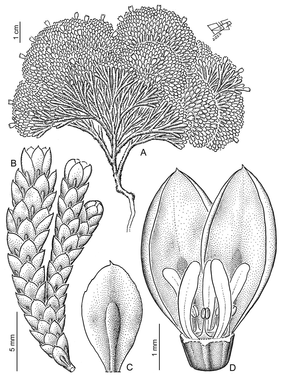A. Planta. B. Porción de rama florífera. C. Hoja, vista adaxial. D. Flor, con tres sépalos removidos.