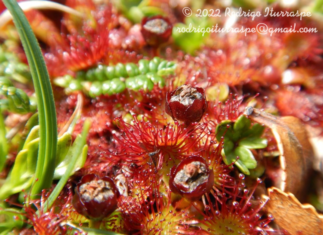 Hierba acaulescente hasta de 2,5 cm de alto, formando hibernáculo en el invierno. Hojas en roseta, adpresas al suelo cuando jóvenes y luego patentes, láminas espatuladas, de 2-5 × 2,5-6 mm, ápice obtuso, márgenes y cara adaxial con emergencias glandulares (tentáculos) rojos, superficie abaxial glabra; peciolos de 3-6,5 × 1-1,8 mm, bien diferenciados de la lámina, glabros; estípulas ausentes o reducidas a setas laterales. Inflorescencias 1(-2-3) por planta, de 4,5-12 mm de largo, 1-floras; pedúnculos de 3-10 mm de largo, glabros; brácteas ausentes; pedicelos vinosos. Flores con sépalos cortamente espatulados, de 2,5-4 × 2-3,5 mm, fuertemente cóncavos, a veces levemente crenulados, glabros, rojo vinosos; pétalos obovados a unguiculados, de 3-6,5 × 2-4,2 mm, blancos, a veces rojizos o verdosos en la base; estambres de 2-3 mm de largo; ovario 3-5-carpelar, de 1,5-2,5 mm, con 3-5 estilos multipartidos desde la base, estigmas multipartidos. Semillas obovoideas a elipsoides, de 0,5-0,8 mm de largo, castaño oscuras, reticuladas.